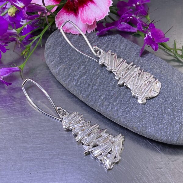 These are long, bark design earrings. Silver pieces laid out and fused together, to look like a piece of Bark. These are the horizontal design bark earrings.