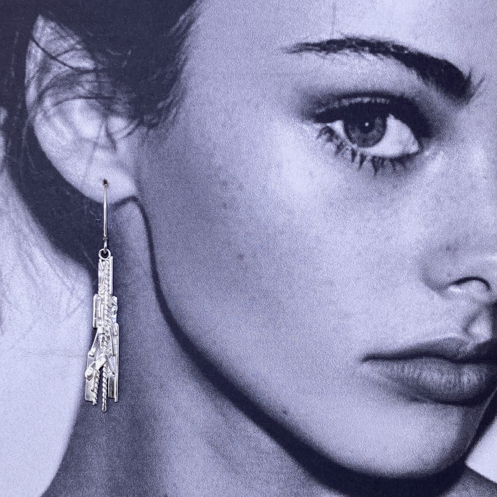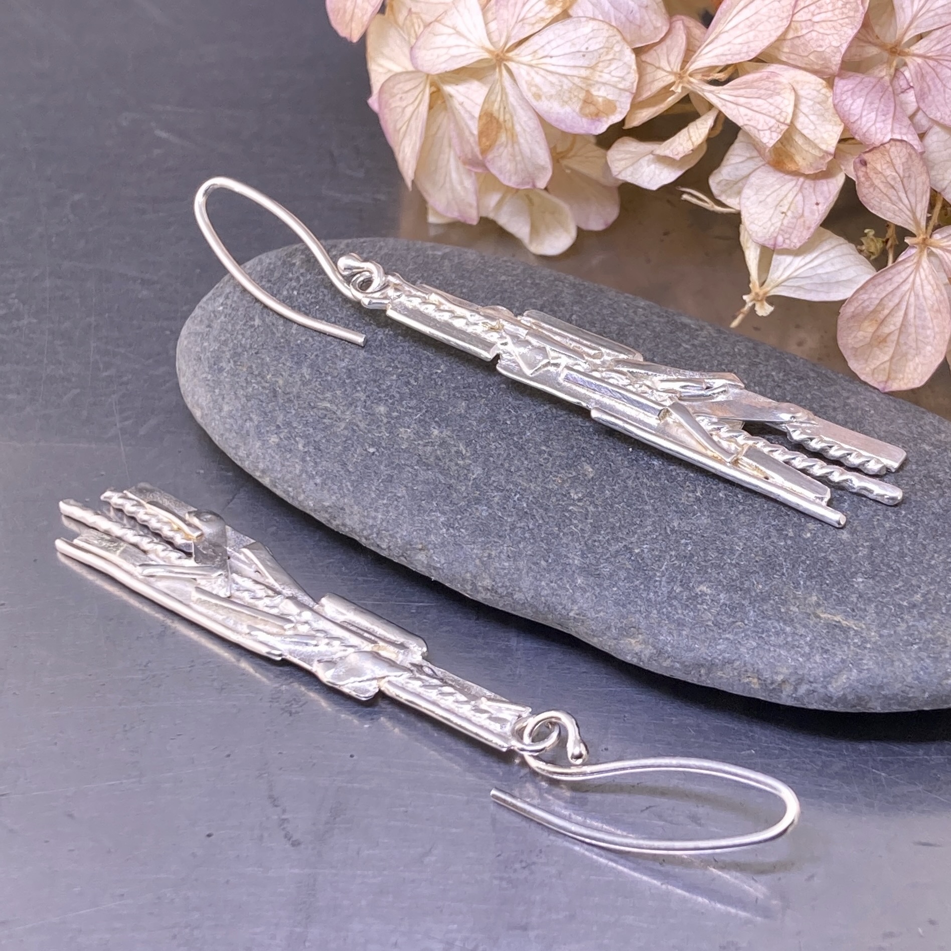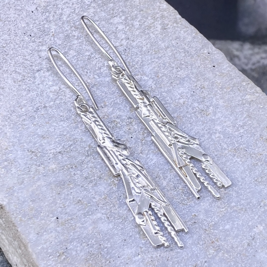 Each pair is handmade, so the surface pattern is always unique. The long vertical form gives them movement and elegance, while the bright polished finish highlights every fine detail in the silver. They feel bold yet natural — balanced between structure and wildness.