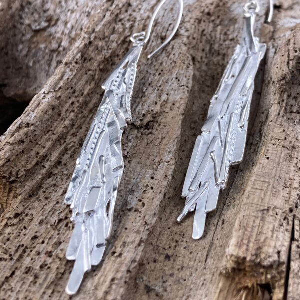 These are very long, bark design earrings. Â Silver pieces laid out and fused together, to look like a piece of Bark. Â These are the vertical design, bark earrings.