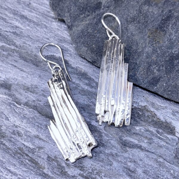 These are very long, bark design earrings. Silver pieces laid out and fused together, to look like a piece of Bark. These are the vertical design, bark earrings.