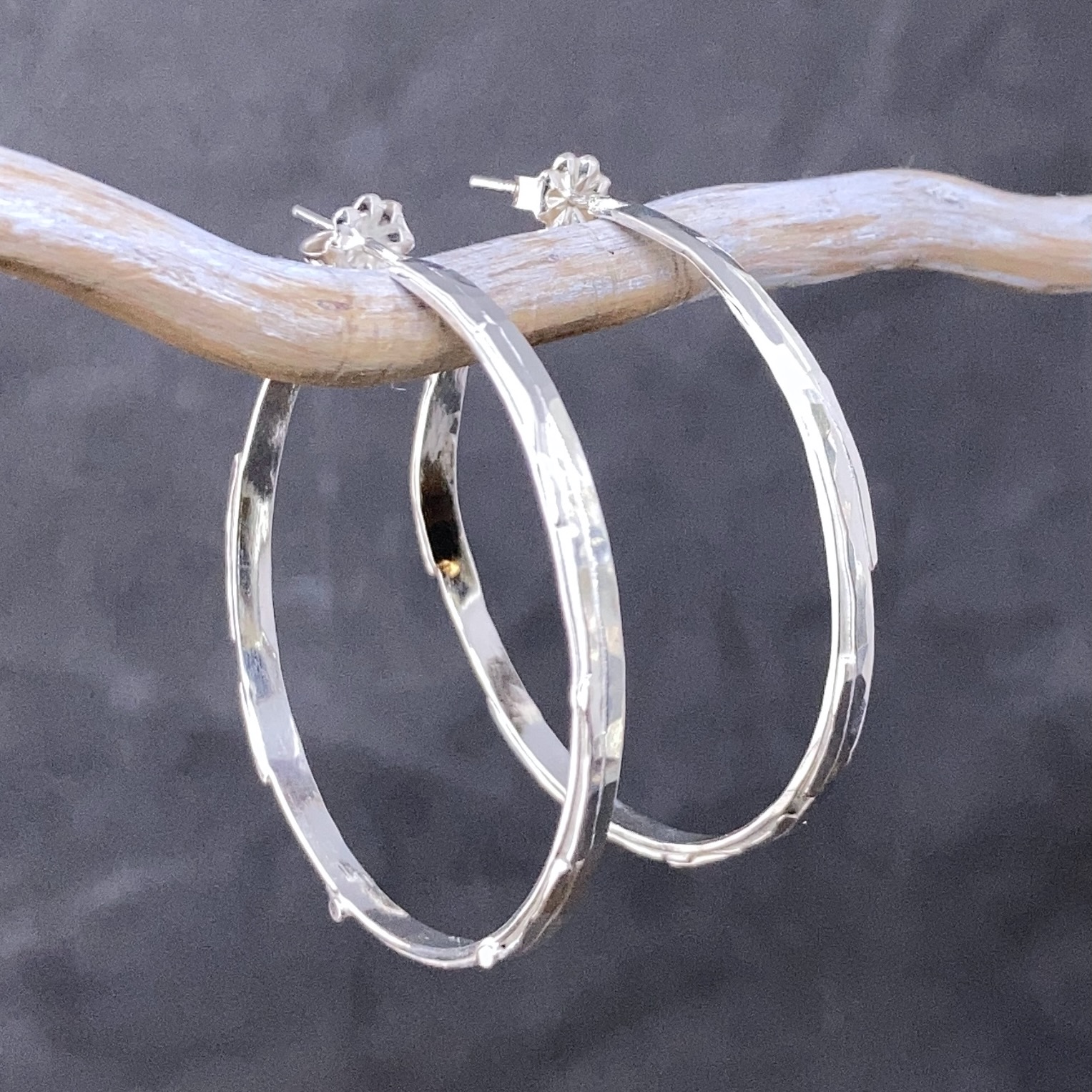 Bark design earrings.  I start with a narrow strip of silver and add bits and pieces of silver wire.  I fuse all the silver together – and hammer a bit – until a pretty piece of silver bark emerges.  Then it is time to solder on a post and shape into a perfect hoop earring.  Every earring has handmade interest – the modern concept of a Hoop with the old forest charm of Bark.