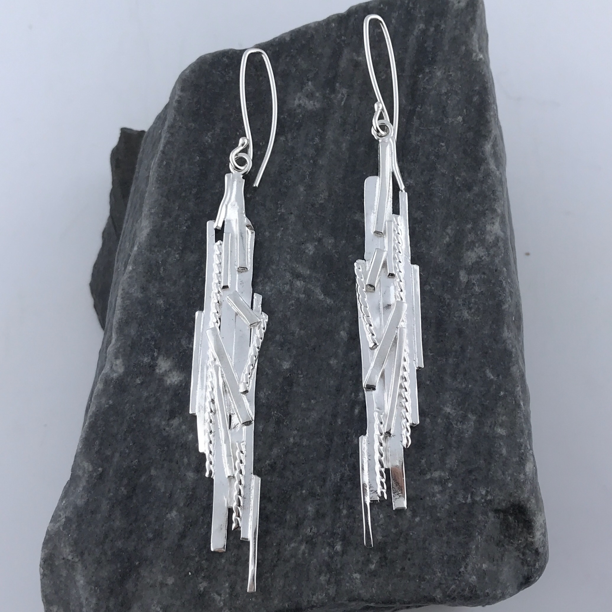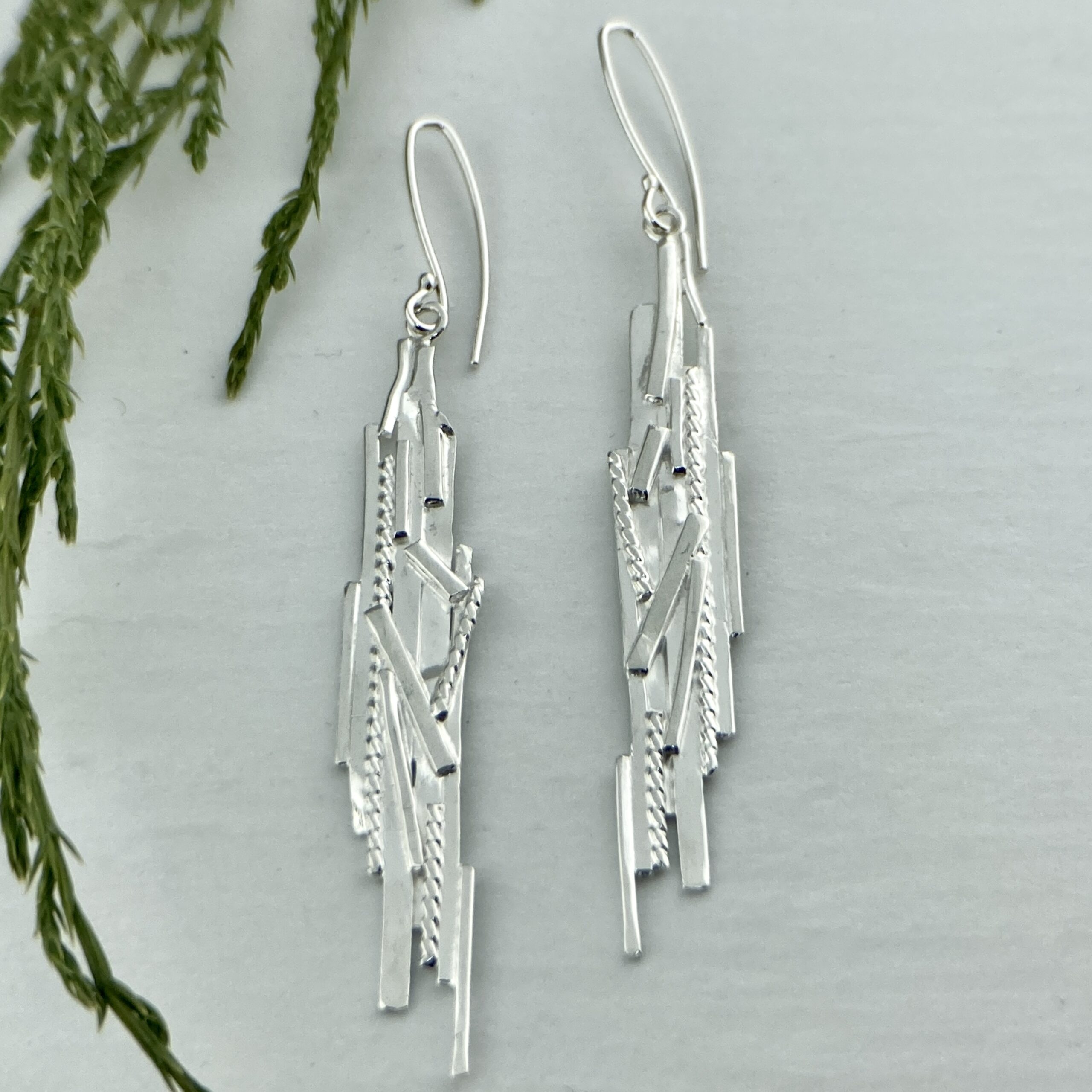 Handmade Argentium silver Bark design earrings with a long flowing shape and natural texture.