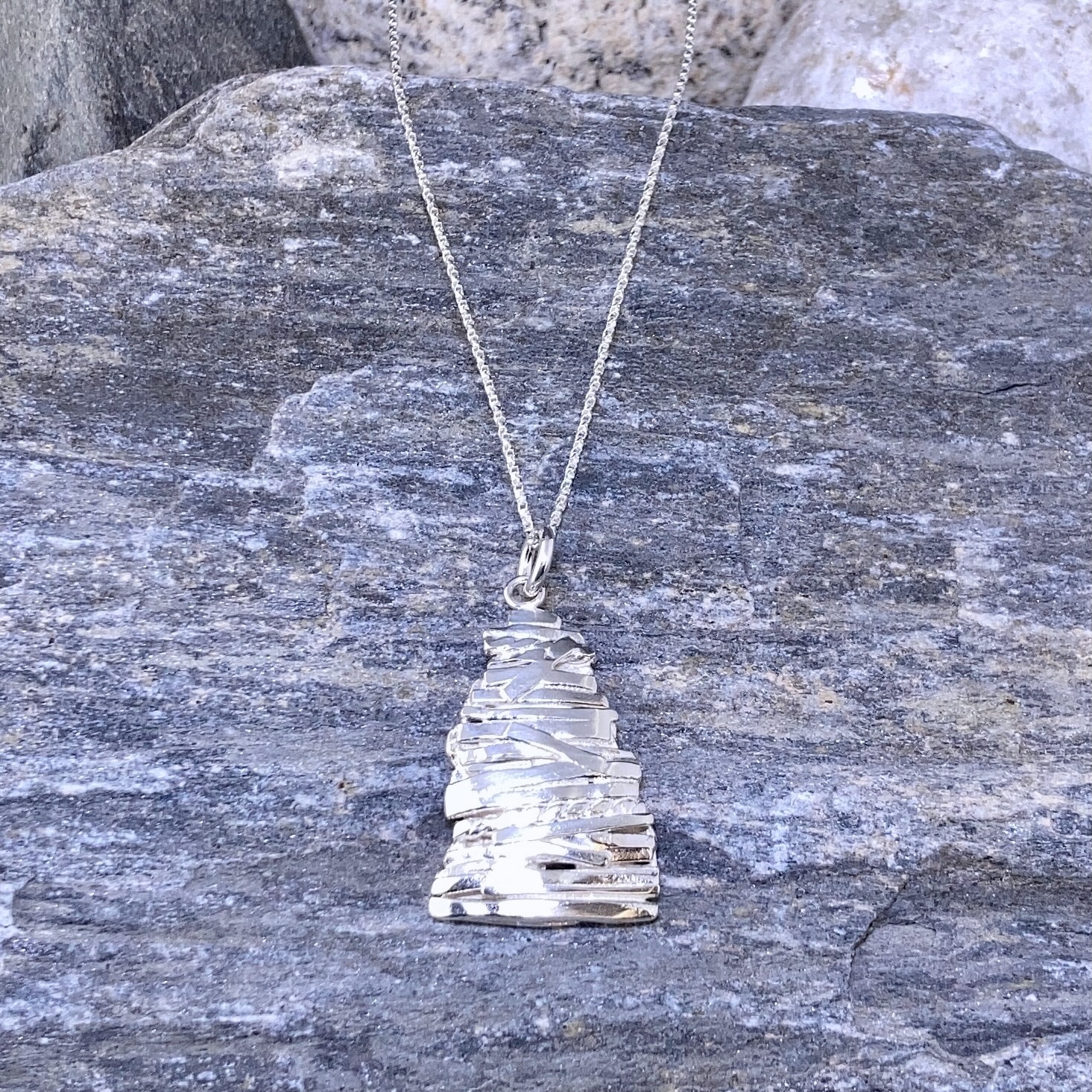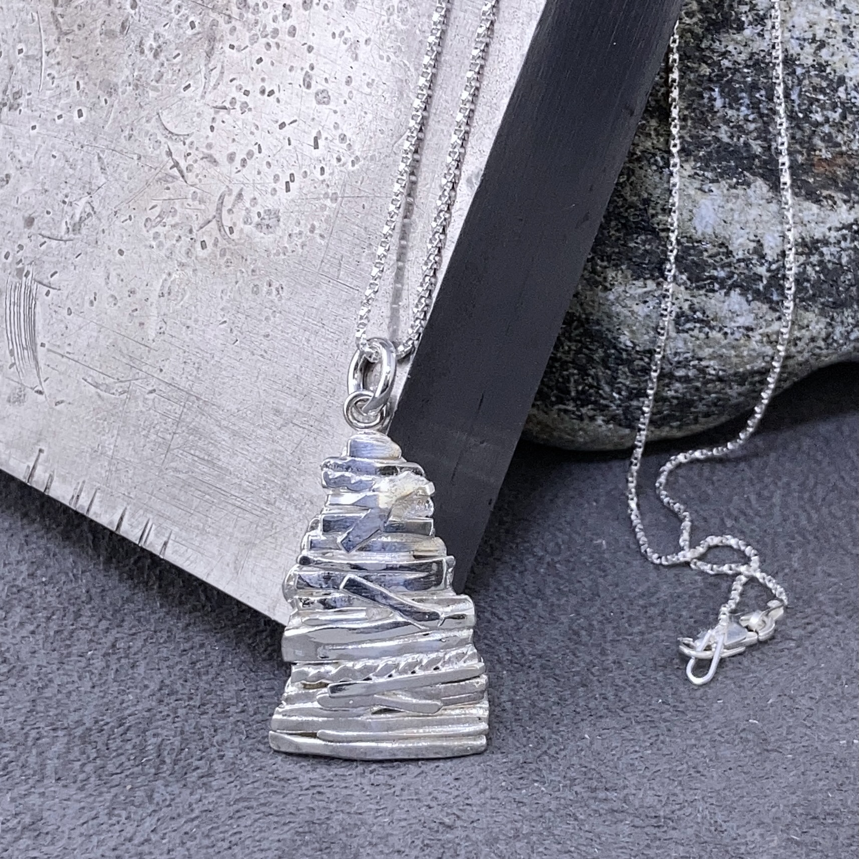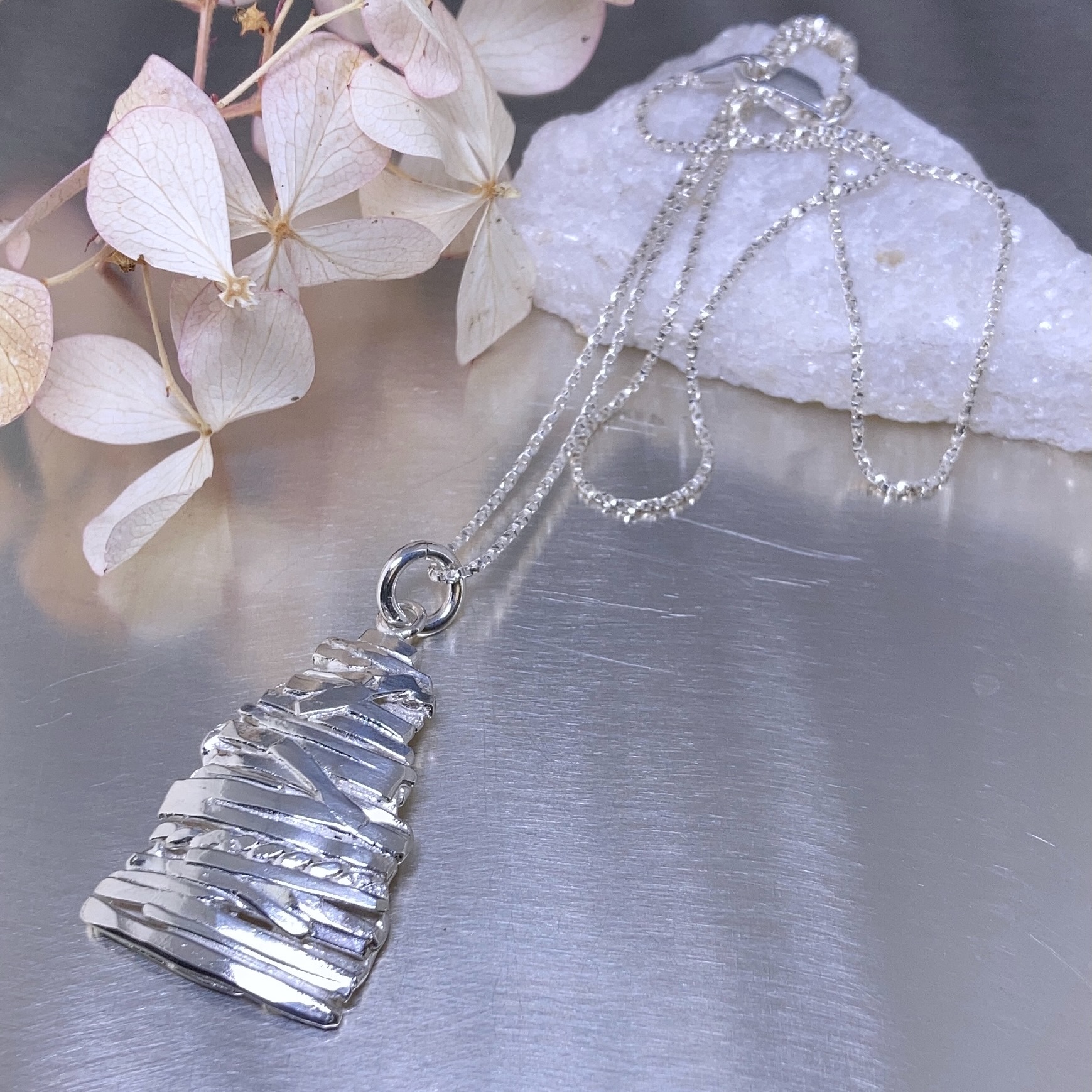 Bits of Argentium silver ‘twigs’ laid overtop each other and fused. Then more bits of silver, until a solid piece of silver bark is created. This pendant I have made the bark horizontal.