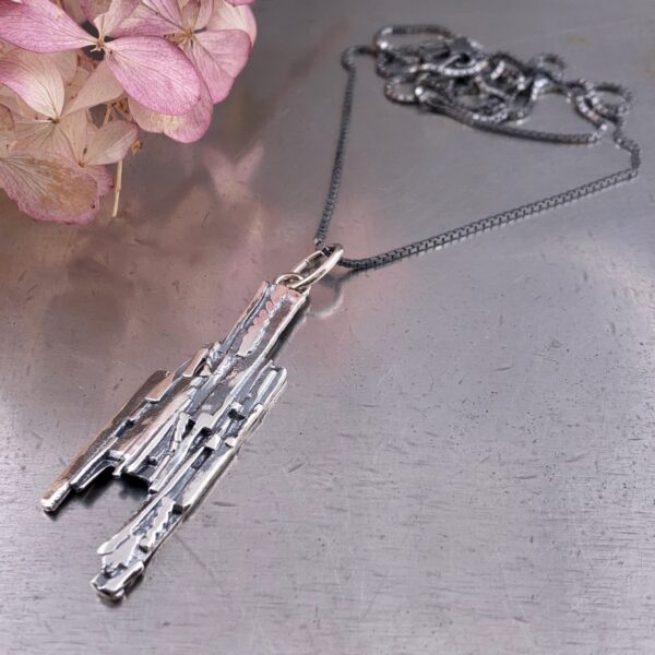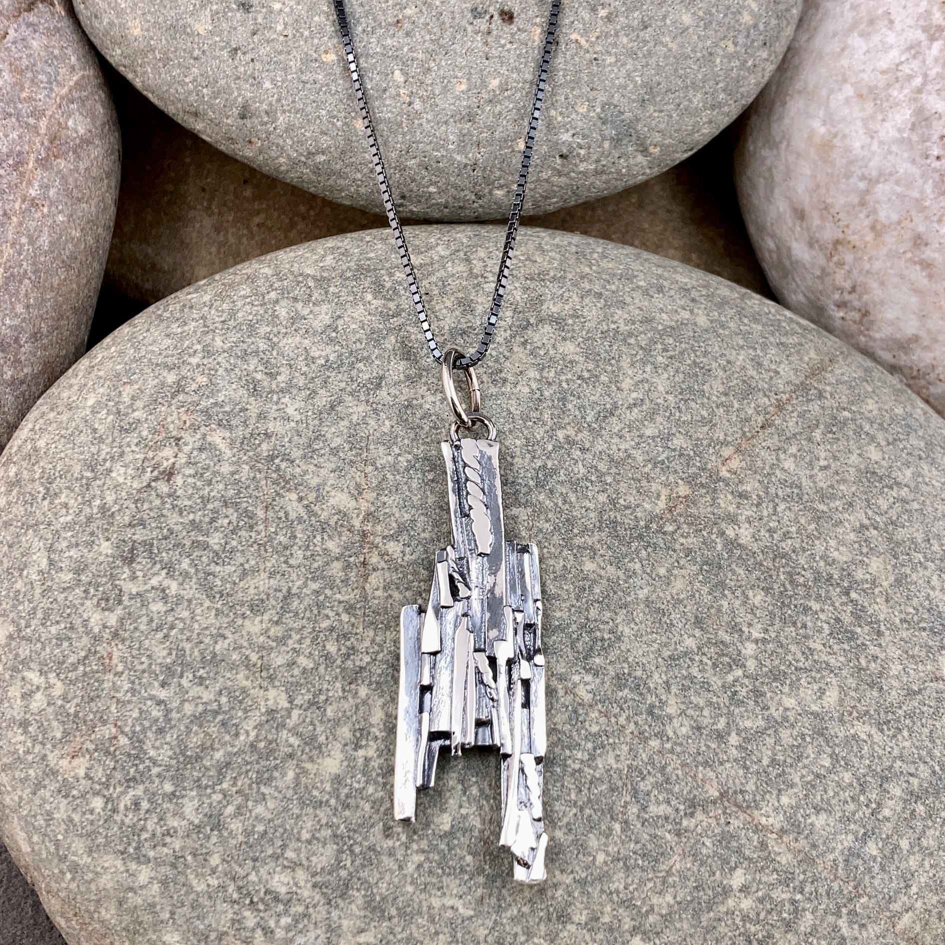 This Bark design pendant comes on a 2.5 mm Sterling Silver Round box chain (24″) that I have applied an antique patina to – so a perfect match for the pendant.