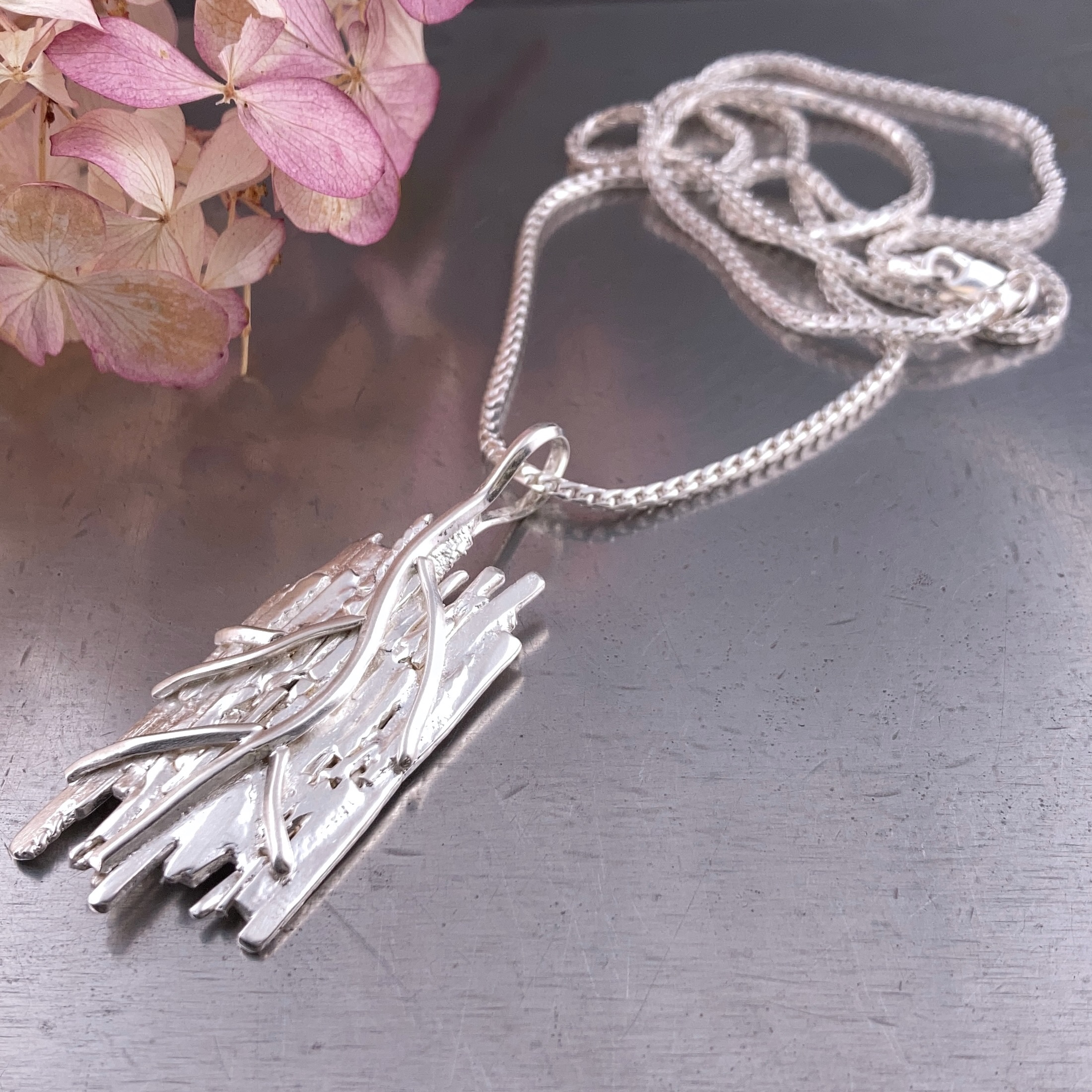 This pendant is a layer of heavy bark – with a silver branch laying across the top.