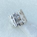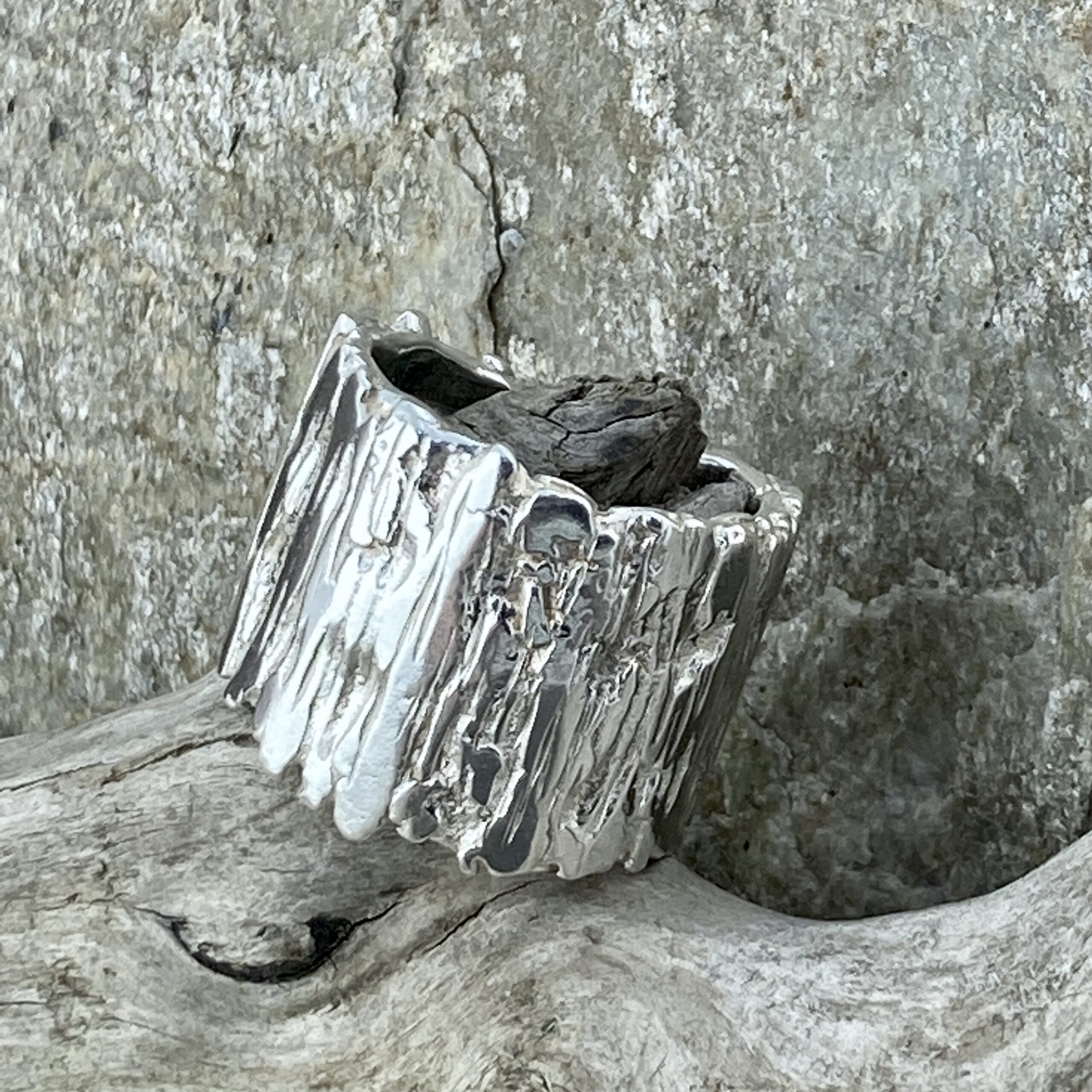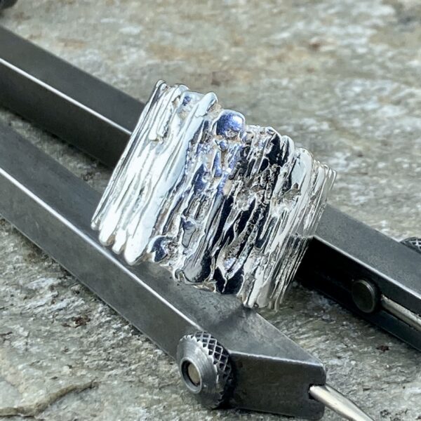 I make several different styles of Bark rings – because it is such a beautiful, organic pattern. This one is the vertical Bark – with the bark texture running parallel with the finger.  It is made with many layers of Argentium silver wire laid and fused, and then more layers added and fused.
