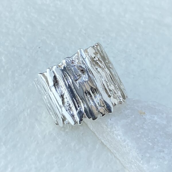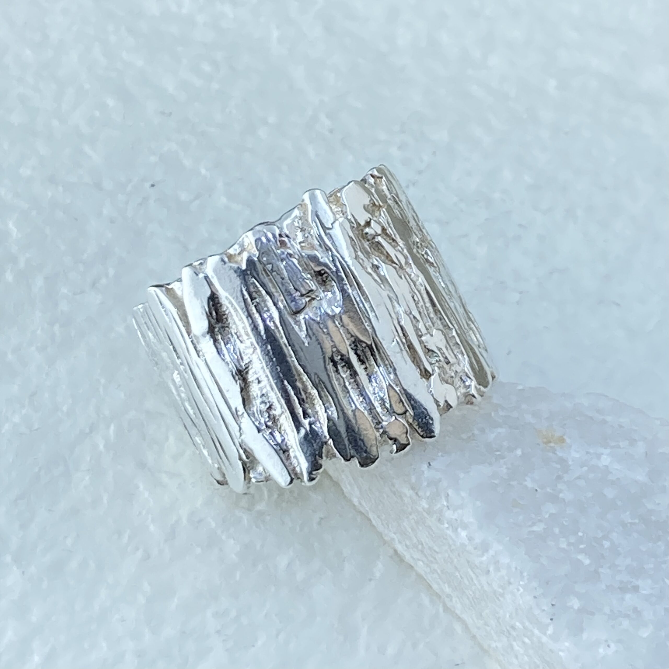 A size 8.75 vertical Bark design ring in solid Argentium silver.