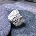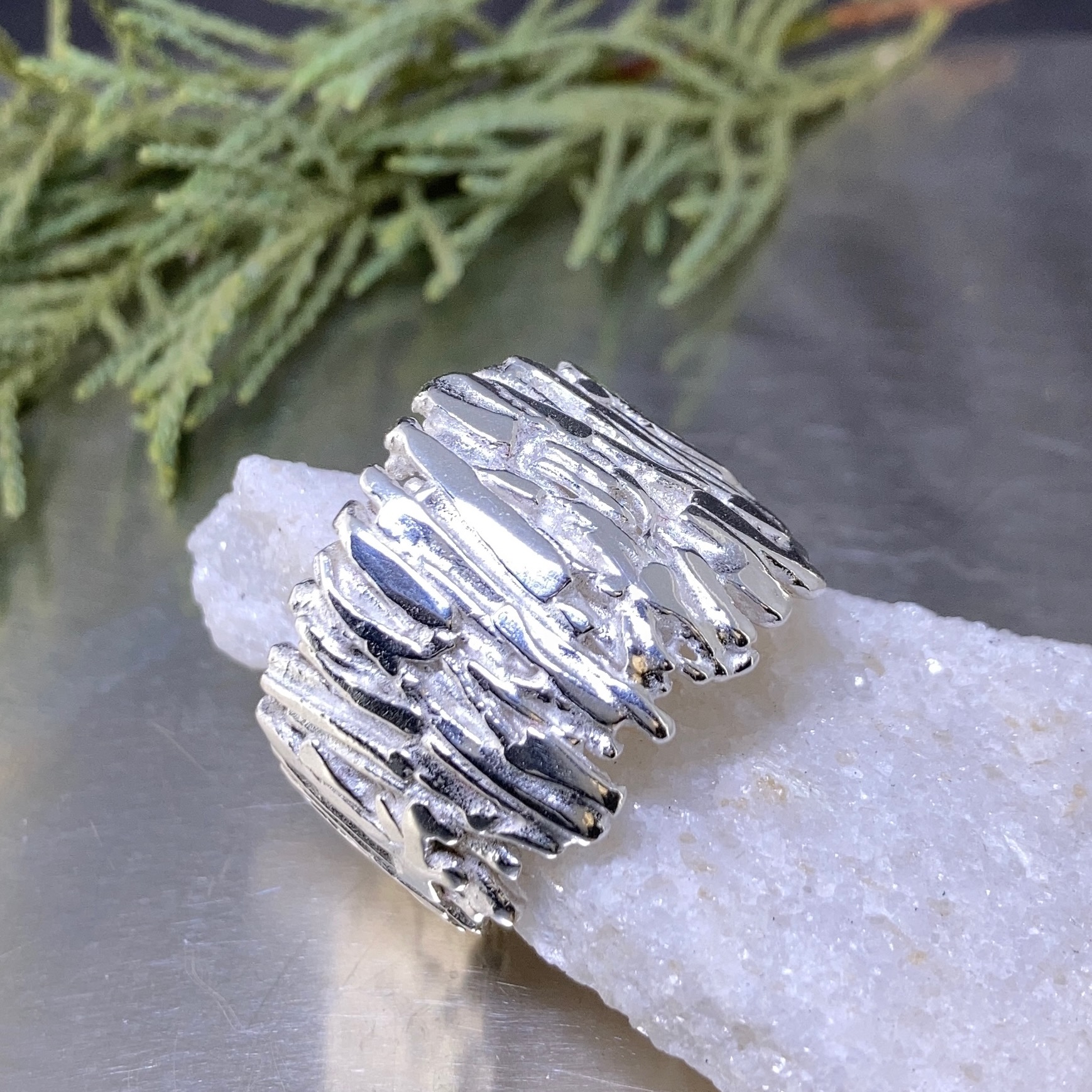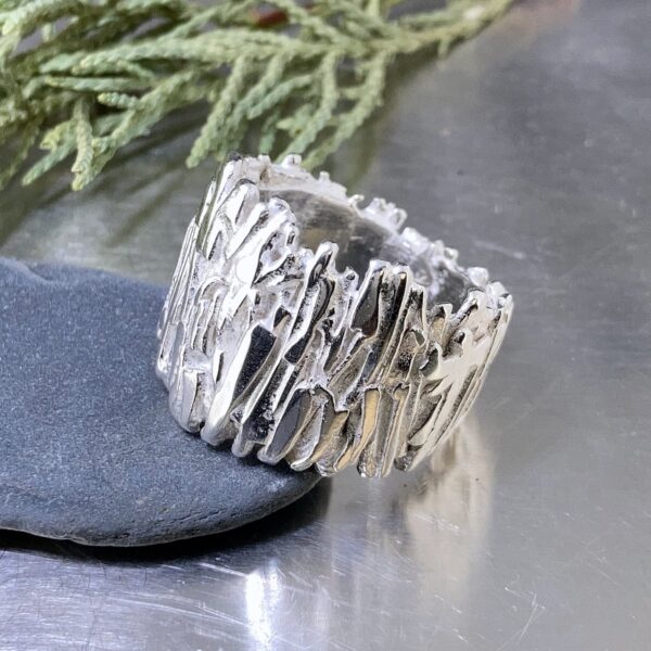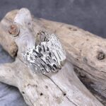 A handmade vertical Bark design. I layer pieces of Argentium silver and fuse them together. Then I continue to add bits of wire and silver and fuse and hammer until I am happy with the Bark design. This ring would be great for a man or a woman – a simple, organic ring – very solid.