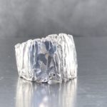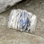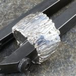 Bark (vertical) – size 9.  Handmade with solid Argentium silver.  I take pieces of Argentium wire and bend and hammer them to be more ‘organic’ looking.  Then I pile them up and fuse them into what looks like a strip of silver Bark.  More hammering –  then I bend the ‘bark’ into a ring band and fuse the ends together.  More hammering – and a substantial Argentium silver Bark ring is created.