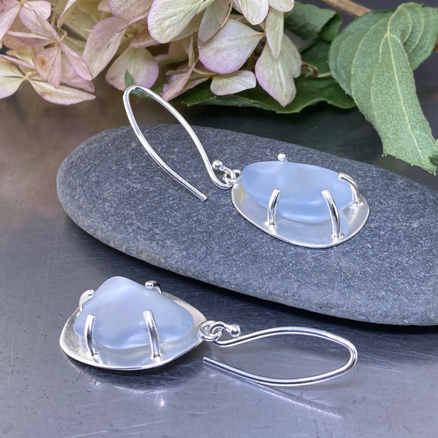 beach glass earrings – prong setting – Argentium silver – powder blue