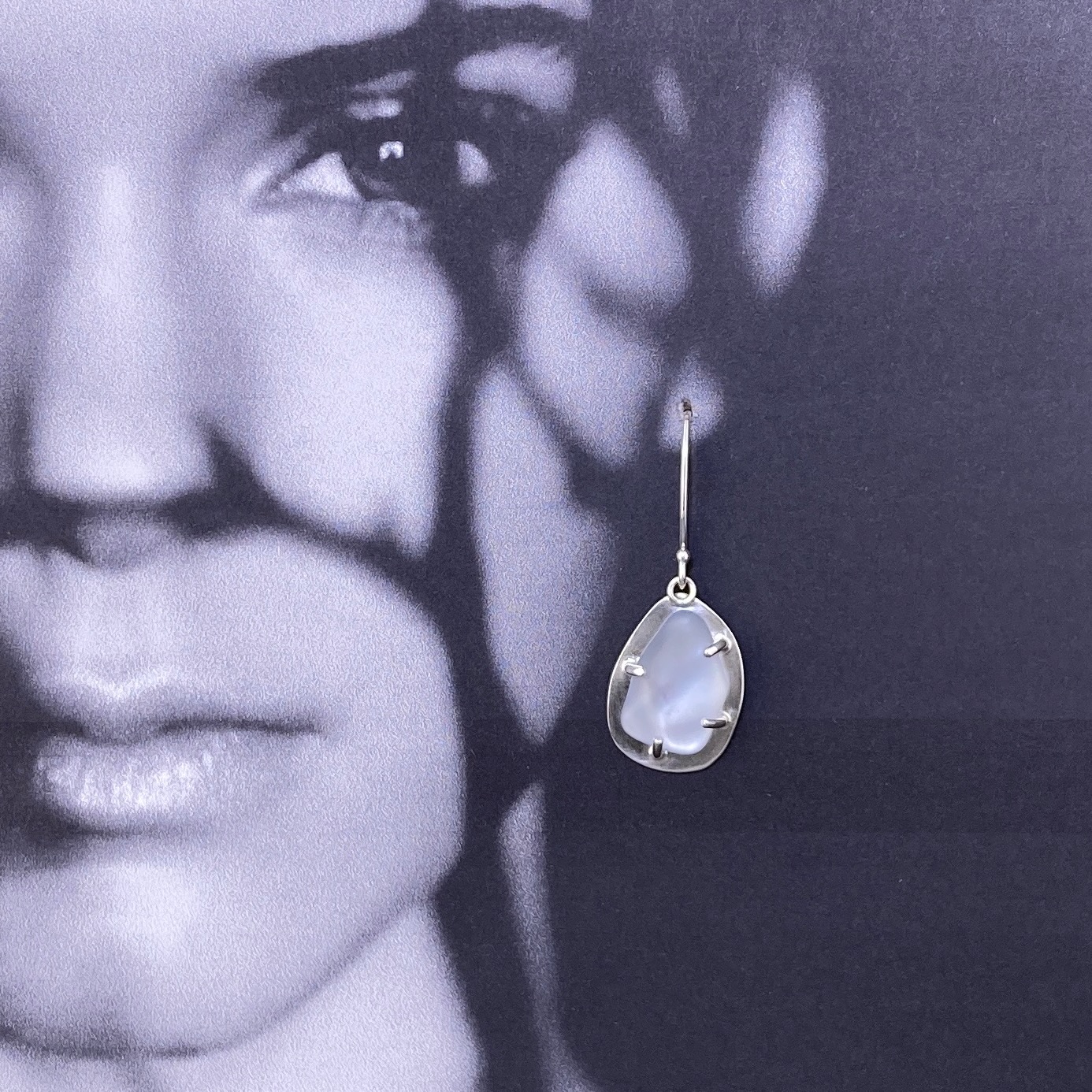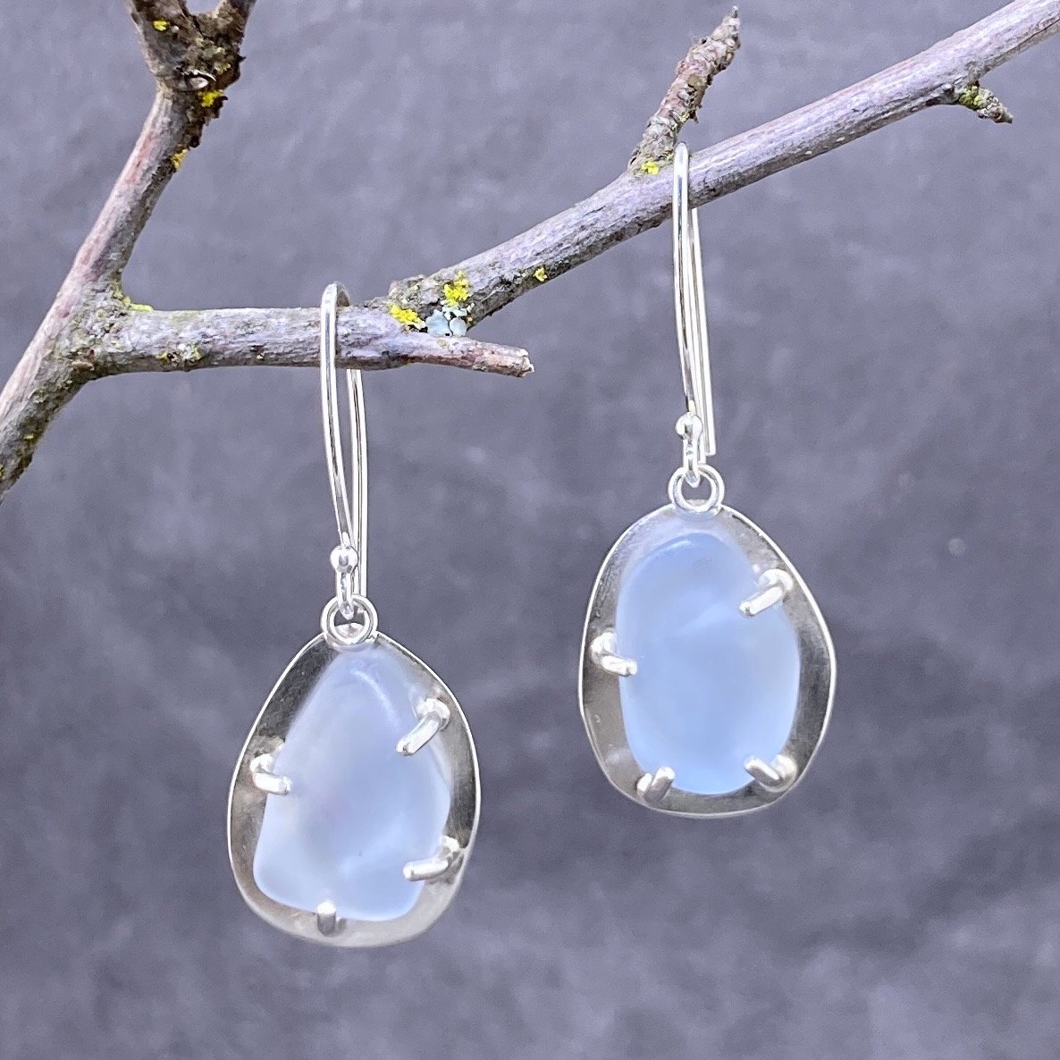 This earring design is a solid sheet of Argentium silver, with prongs soldered to the base to wrap over the Beach Glass.  This design creates a secure base while allowing all the light to sparkle the Beach glass.