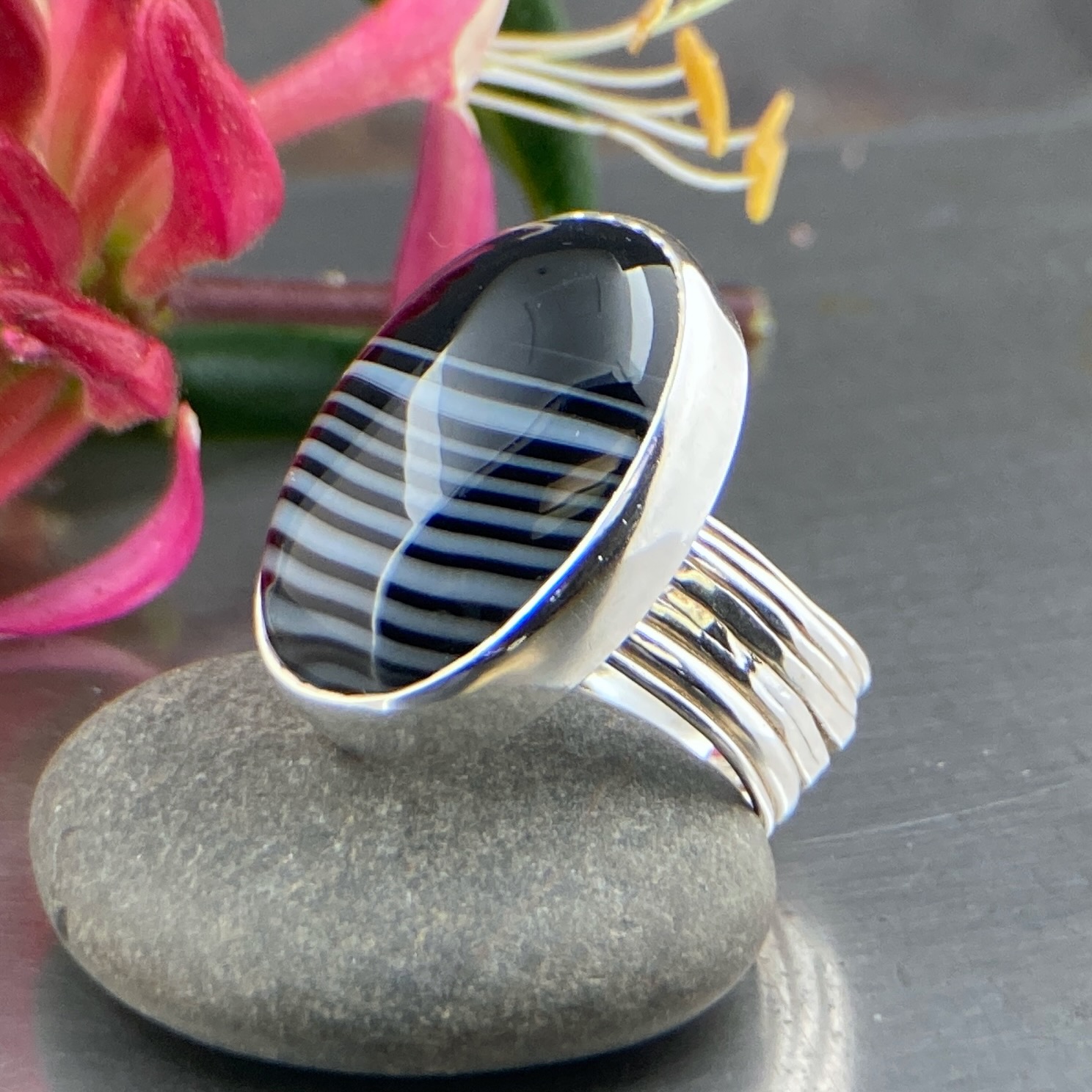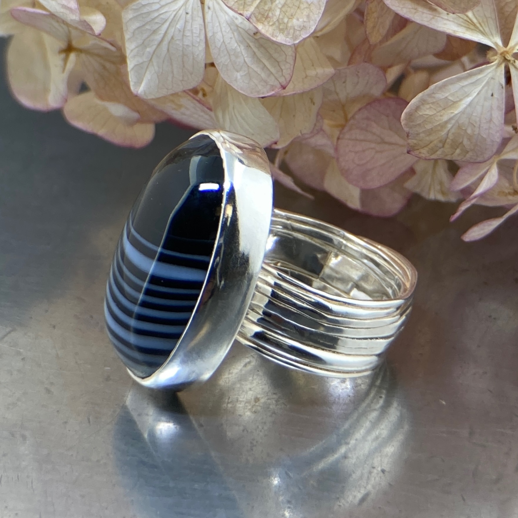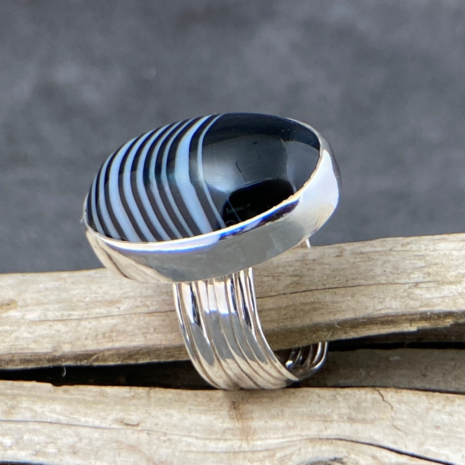 This natural Black Line Agate is cut in a large oval cabochon. It shows striking bands of black, grey, and cream that shift softly under light. Set in a smooth bezel, the gem adds depth and grounding contrast to the silver.