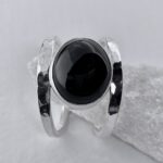 The gemstone is a natural 11.5 carat Black Star Diopside, oval cabochon cut and bezel set. Under light, a fine four-point star appears — a natural effect called asterism. The deep black tone and the star’s reflection create a striking contrast against the bright silver band.