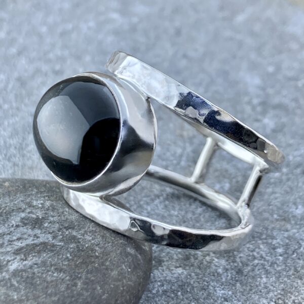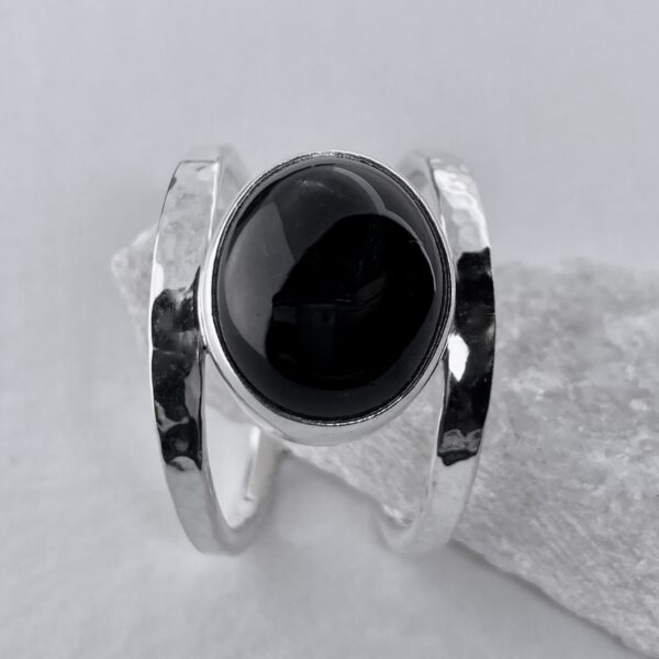 Each ring is handmade in Argentium 940 silver. I shape and fuse two round bands together, then hammer the surface for texture and depth. The double-band form adds strength while keeping the fit light and smooth. The oval setting sits neatly between the bands, giving the piece a clean architectural look.
