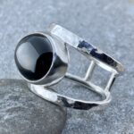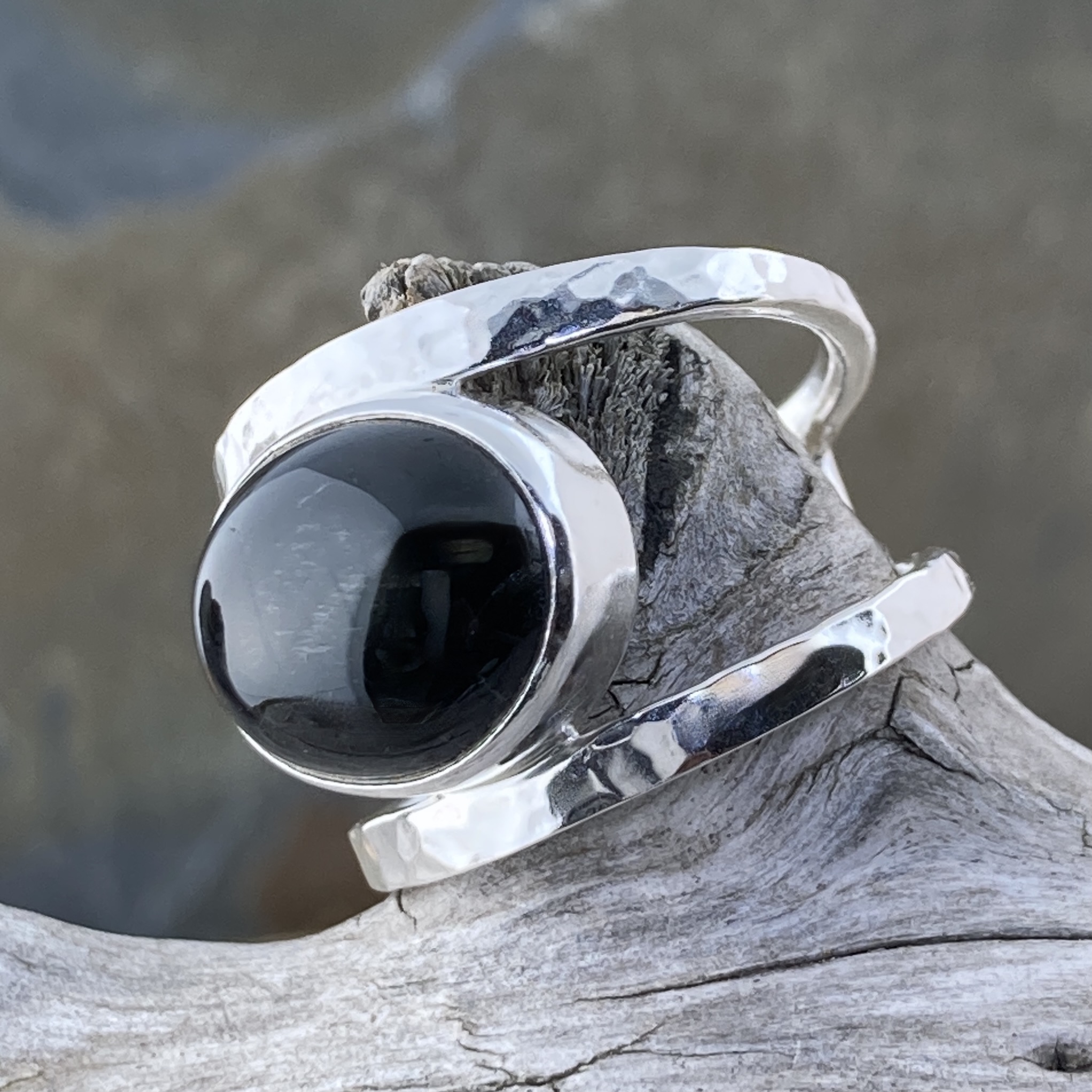 Each ring begins as two bands of Argentium silver, formed, fused, and hammered by hand. I shape the bezel for each gemstone, then fuse it securely in place. The ring is polished to highlight texture and balance, blending strong form with refined detail.