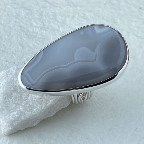 The gemstone is a teardrop-shaped Botswana Agate in a smooth bezel setting. Its fine grey and rose bands flow softly through the stone, giving calm movement and depth. The silver bezel protects the edges and reflects the stone’s quiet tones.