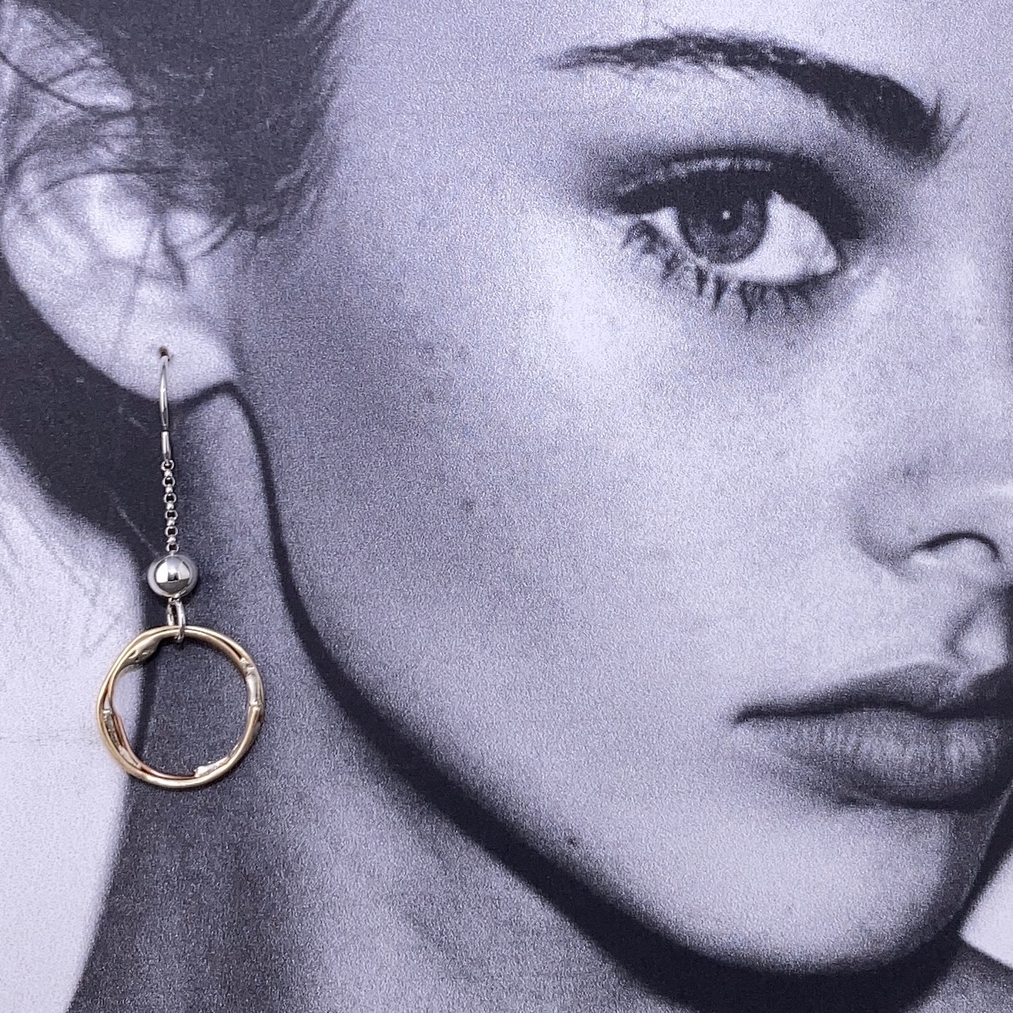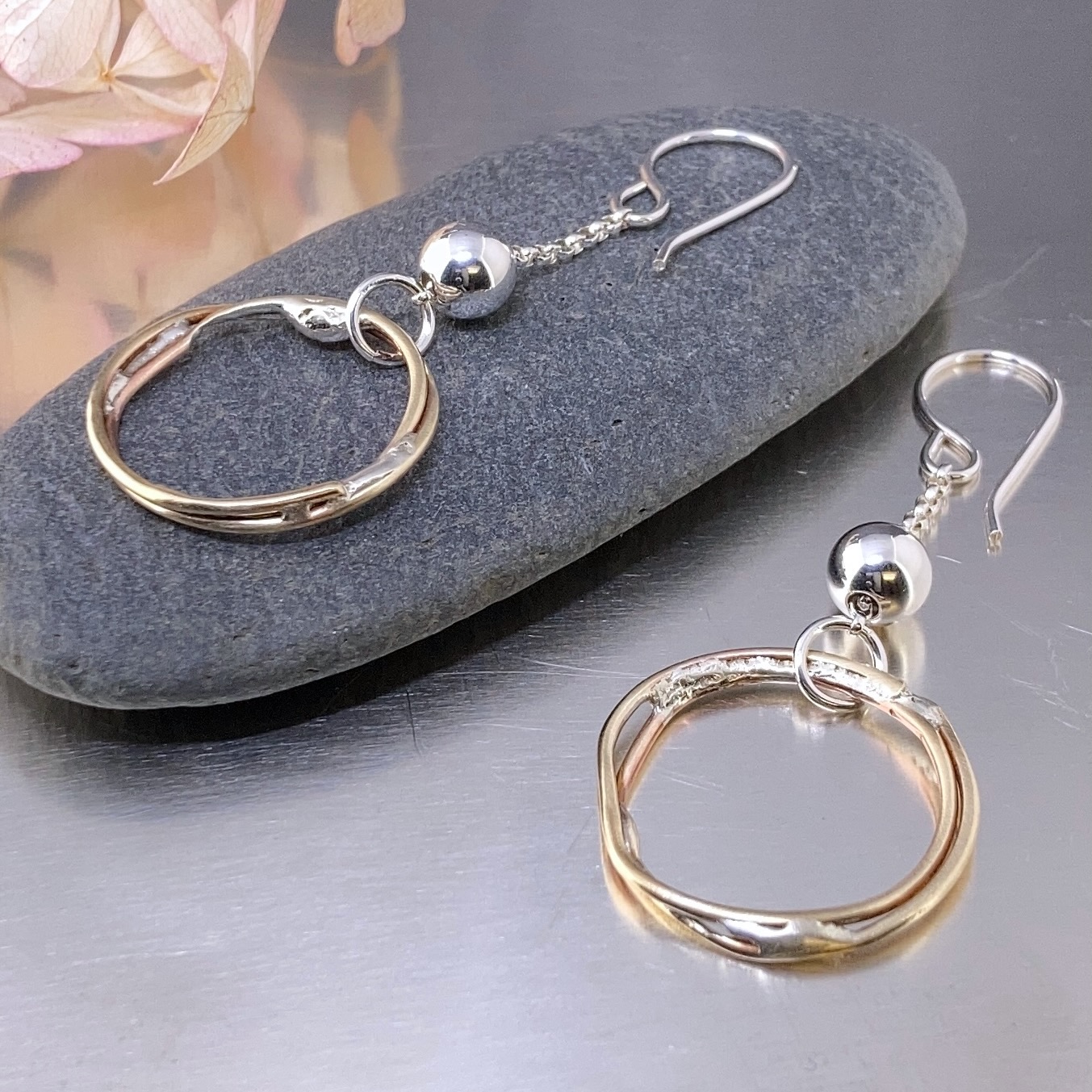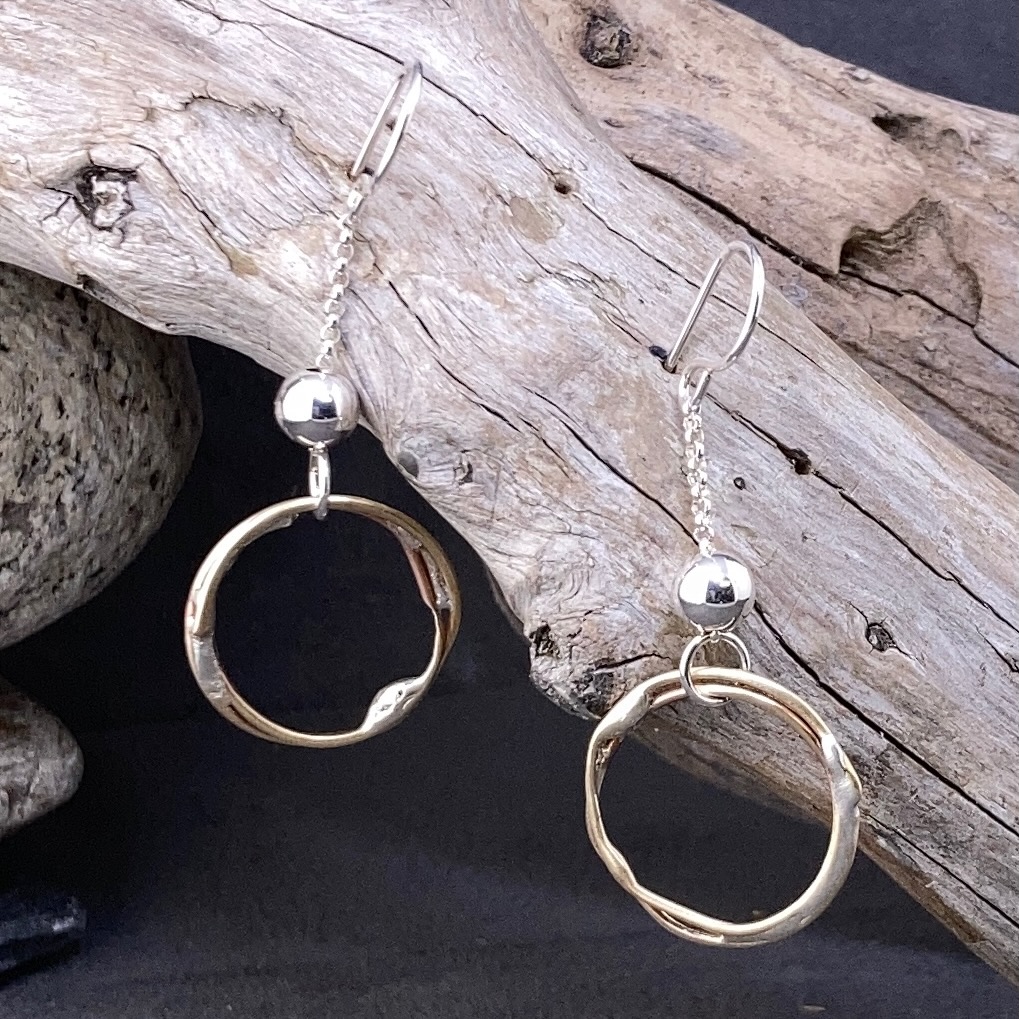 Handmade from solid Brass and Argentium silver  wire.  I wrap the Brass wire to form a rough hollow boulder.  Then I carefully fuse each one by adding molten Argentium silver.  These earrings are dangling from Sterling silver Rolo chain on an Argentium silver ear wire.