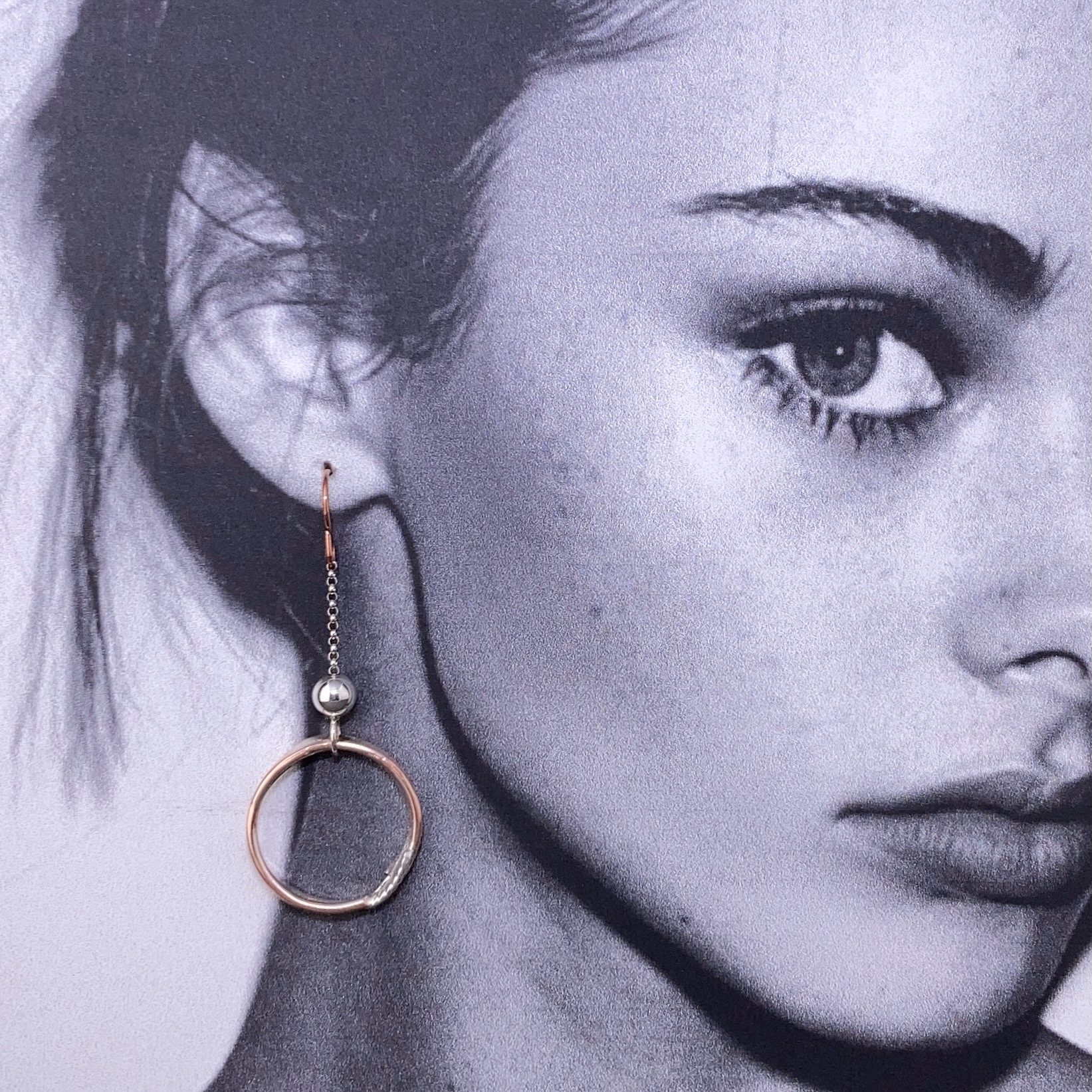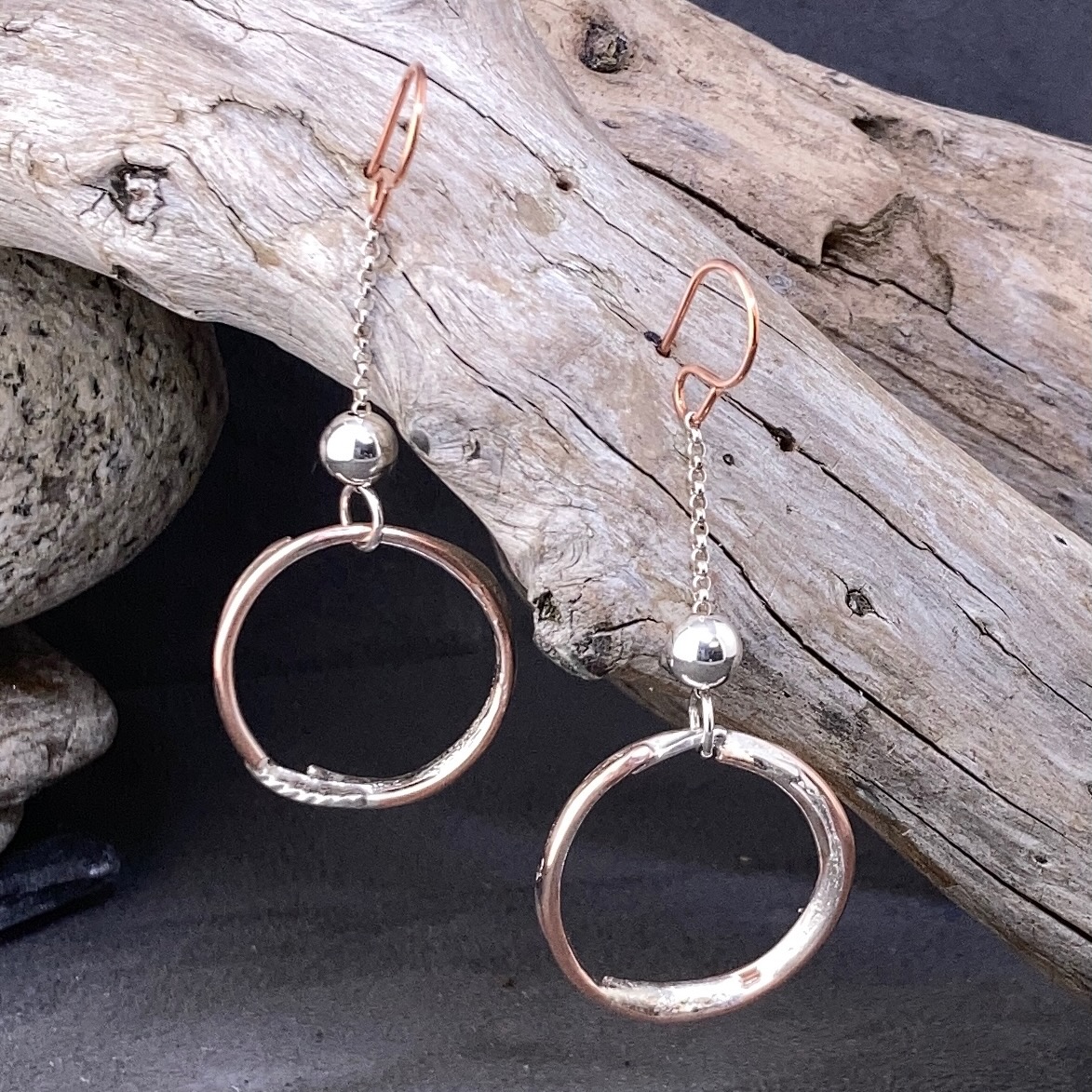 Handmade from solid Copper and Argentium silver wire. I wrap the wire to form a rough hollow boulder. Then I carefully fuse each one by adding molten Argentium silver. These earrings are dangling from Sterling silver Rolo chain on an Argentium silver ear wire.