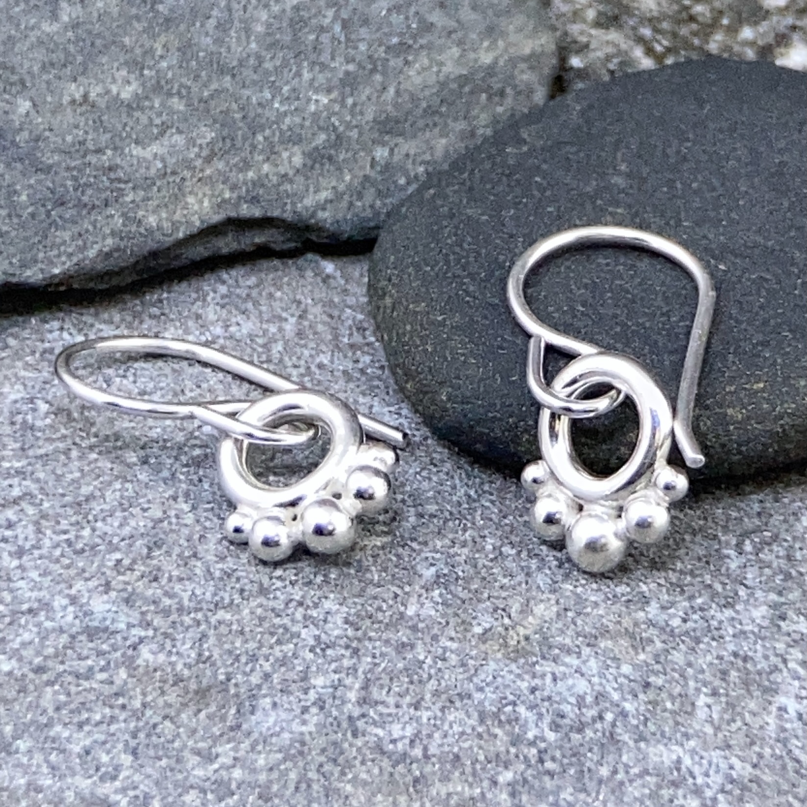 A small hollow boulder with granules fused to the bottom and suspended on an Argentium silver earwire.
