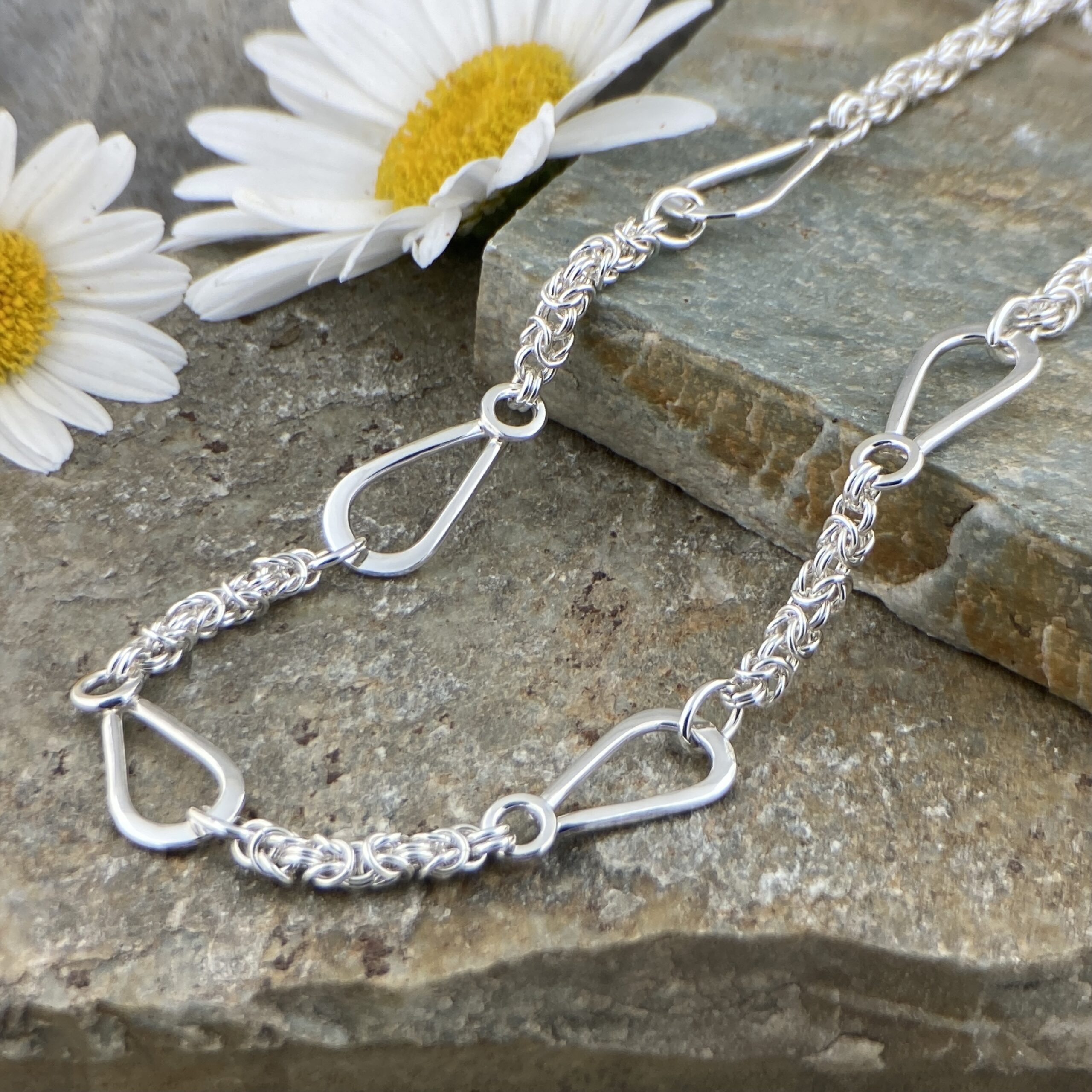 Between each teardrop-shaped buttonhole are handmade byzantine chain maille links. This piece makes a great everyday necklace that you can dress up in various ways. The entire piece, right down to the clasp, is made of Argentium Silver.