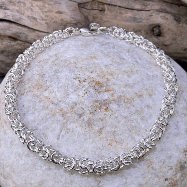 The Argentium Silver Byzantine Bracelet – Fine (20-3) blends crisp geometry with a smooth, silky hand. “Byzantine” is a classic chain-maille pattern built from interlocking rings arranged in tight, repeating units. In this fine 20-3 weave, the links form a narrow, elegant profile that still feels strong. Because it’s crafted in bright Argentium Silver (940), the bracelet keeps its white lustre and resists tarnish. Choose your ideal length for a tailored fit you can wear every day—solo or stacked.