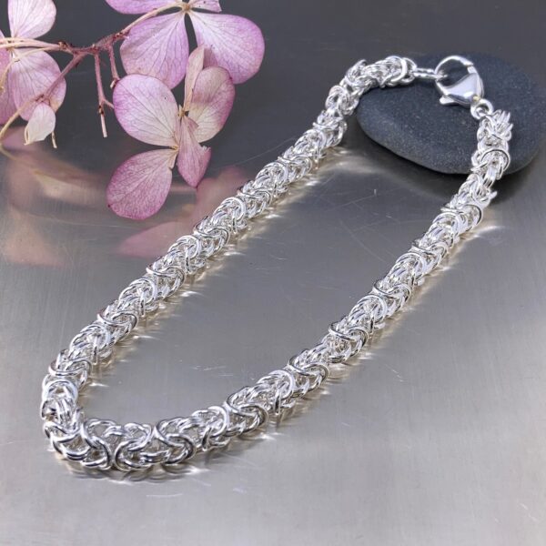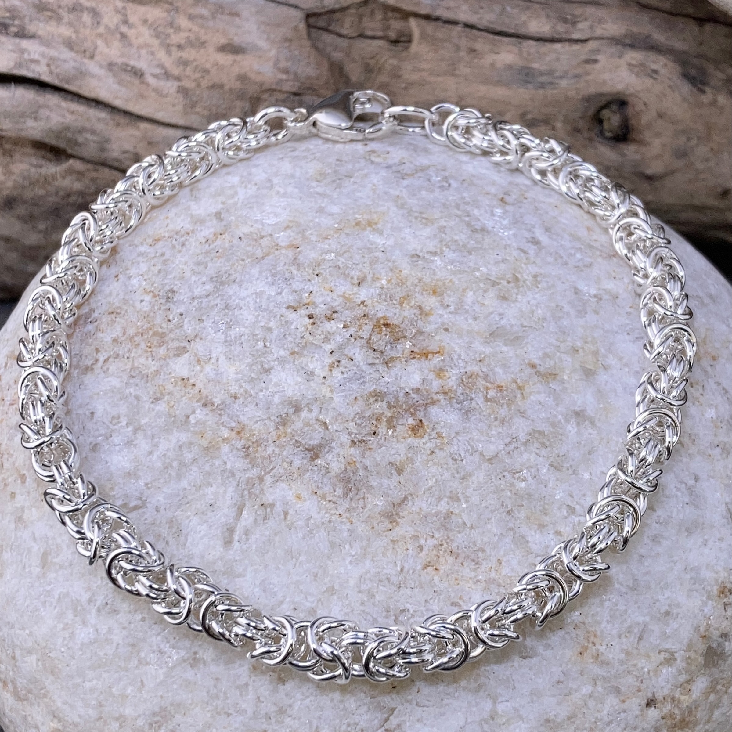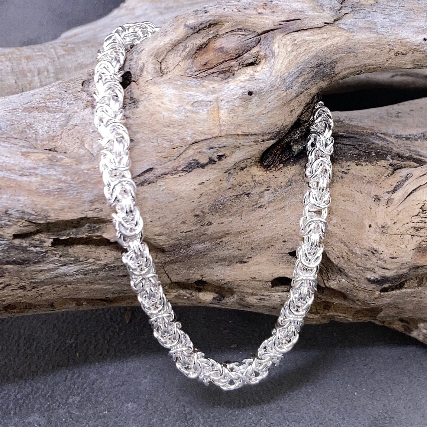 I hand-cut uniform jump rings from solid Argentium silver. Then I weave the Byzantine pattern link by link so every unit sits true and aligned. After assembly, I refine the ends, fit the clasp, and bring the chain to a mirror polish. The result drapes smoothly on the wrist yet reads clean and intentional.