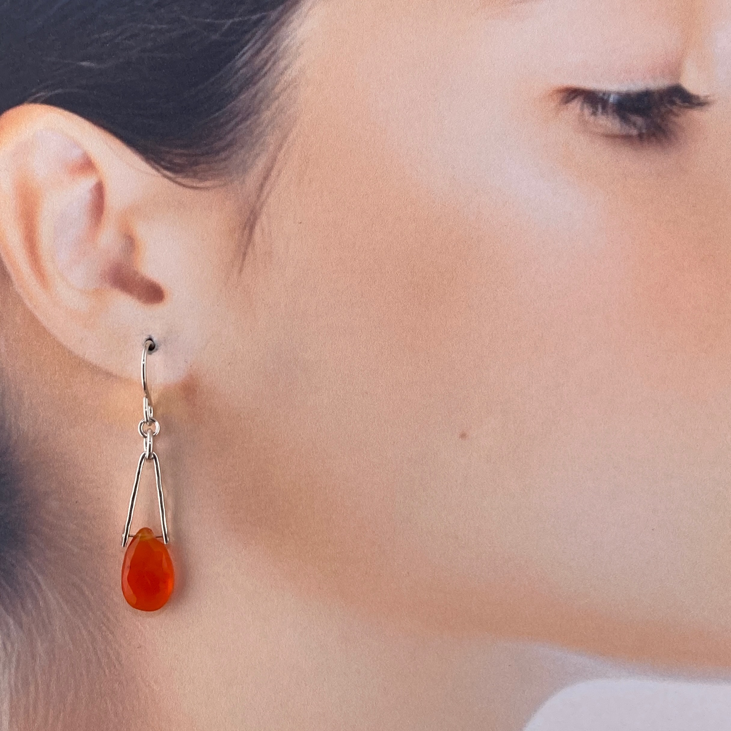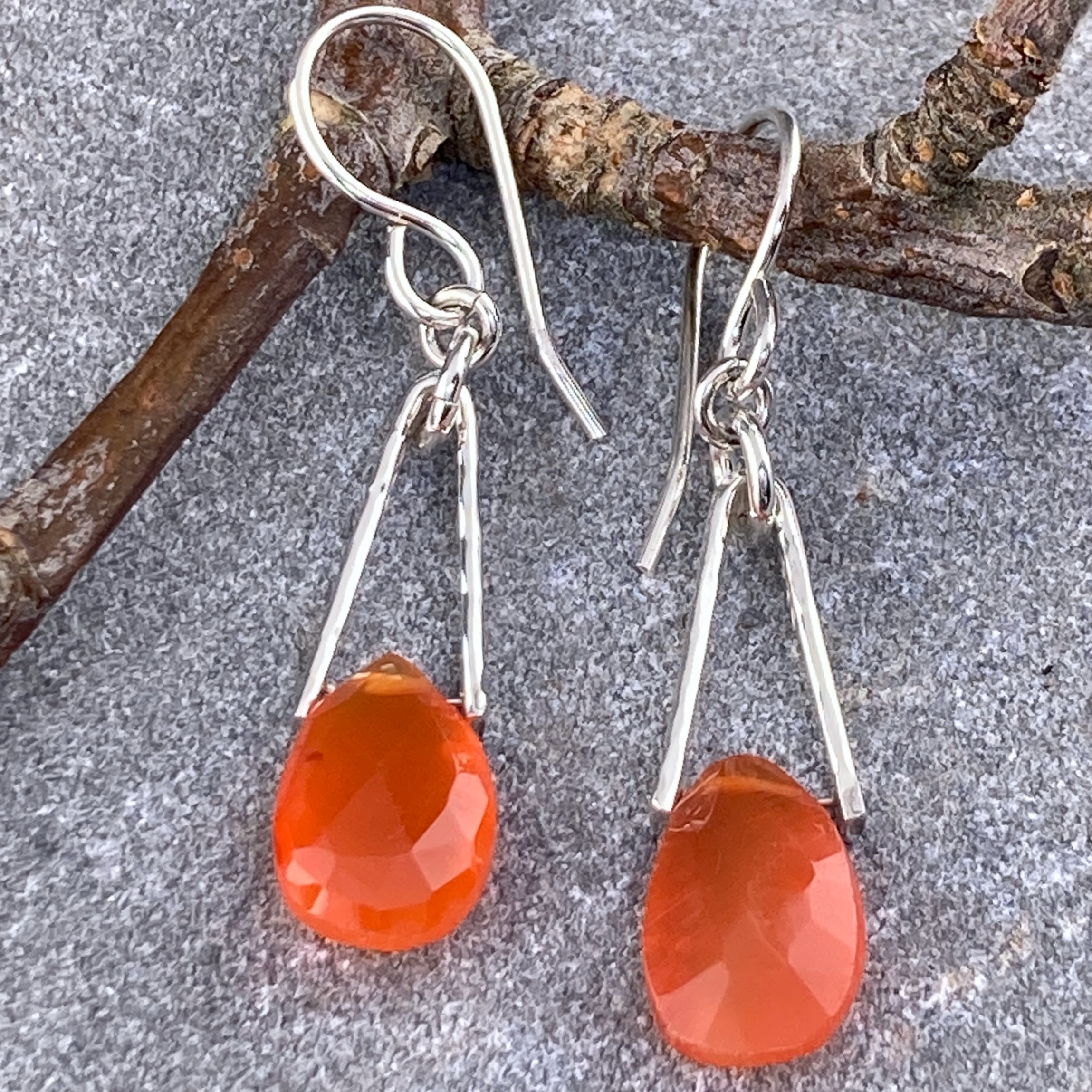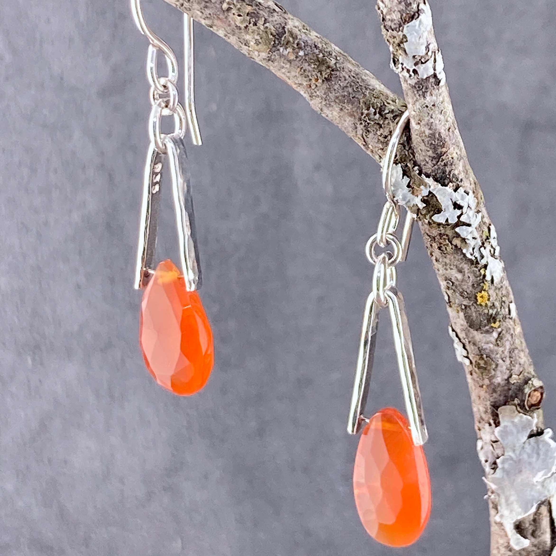 Carnelian suspended on hand hammered Argentium silver V shaped bails.  With short Argentium silver earwires.
