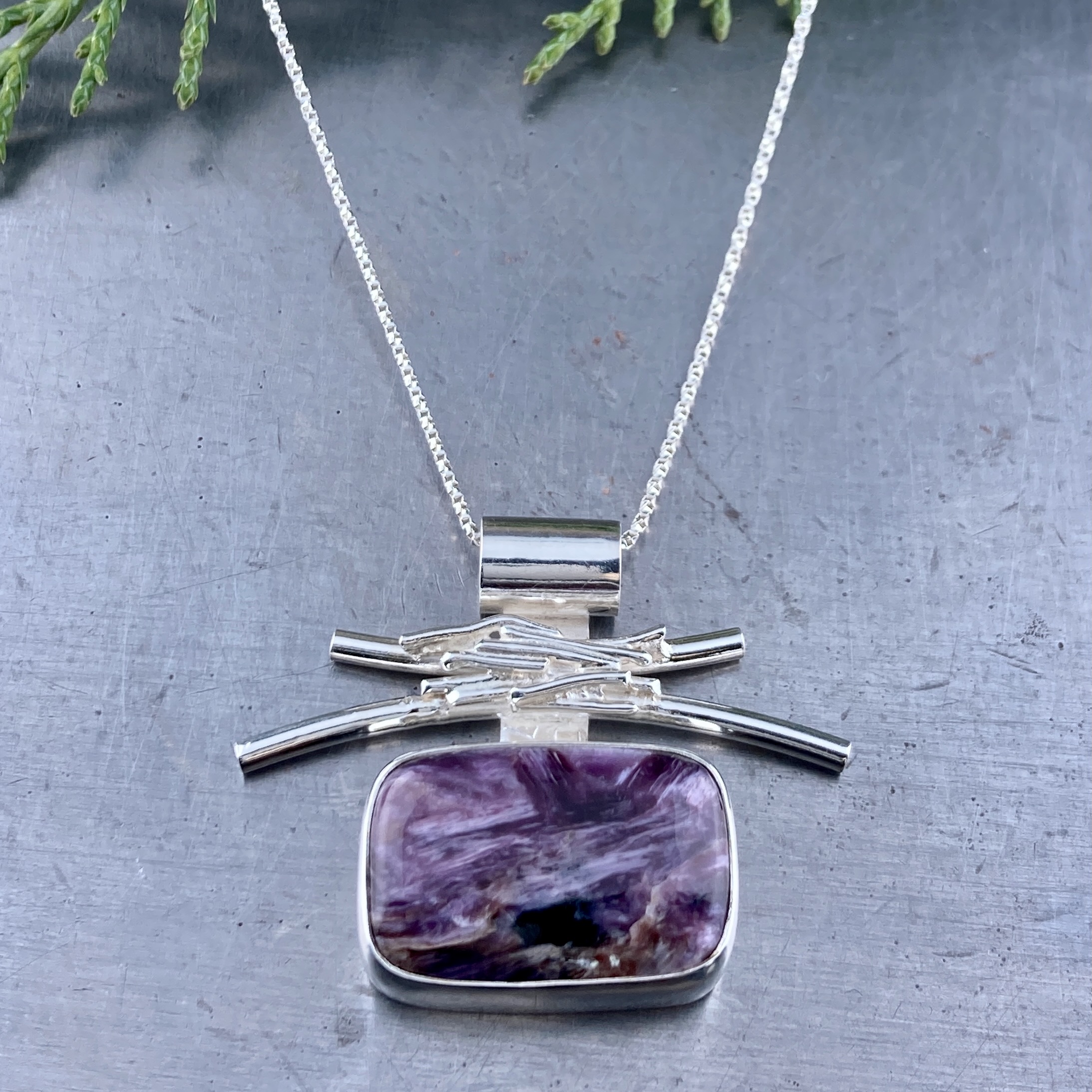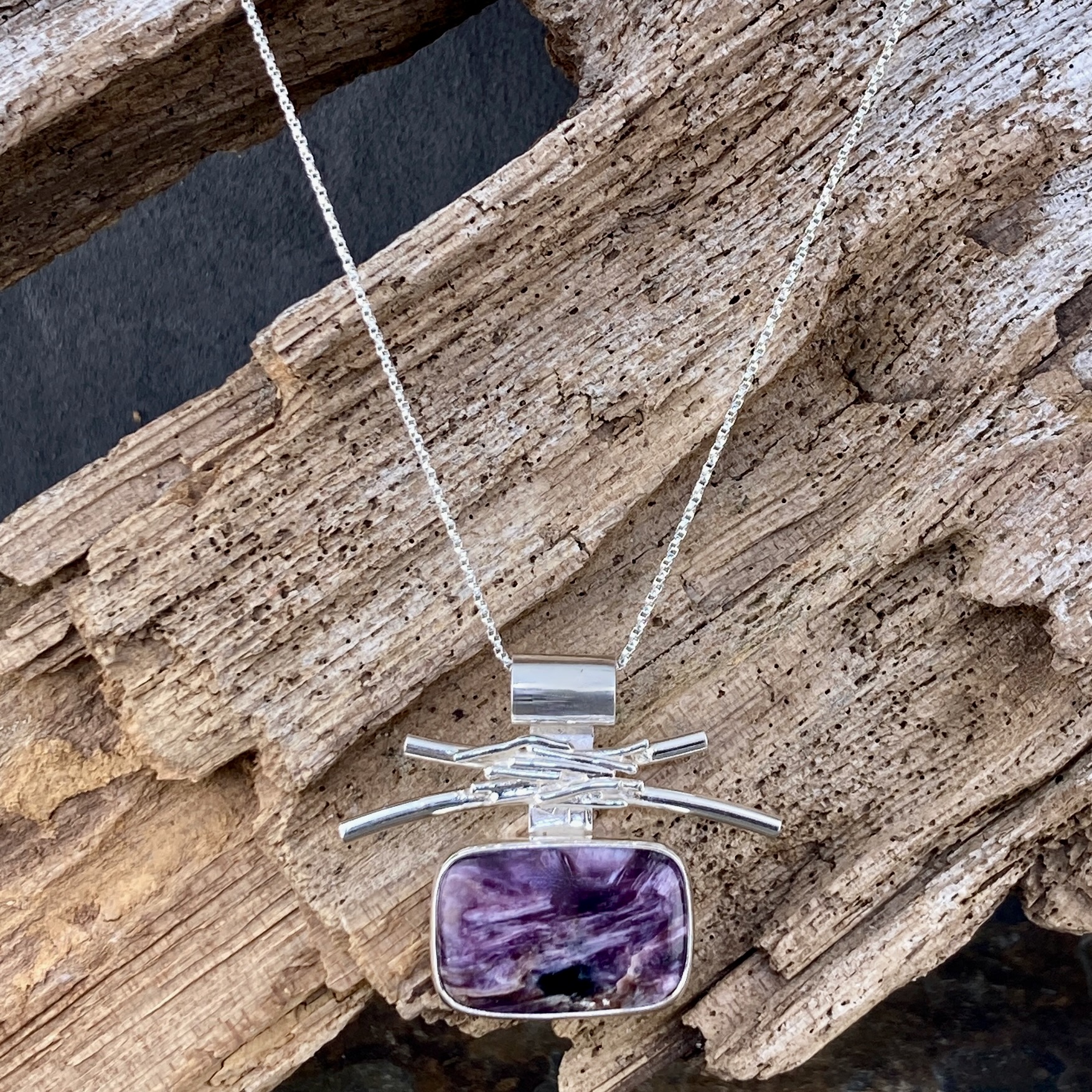 Charoite with a bark and twigs pendant.  Comes with an 18 inch sterling silver chain.