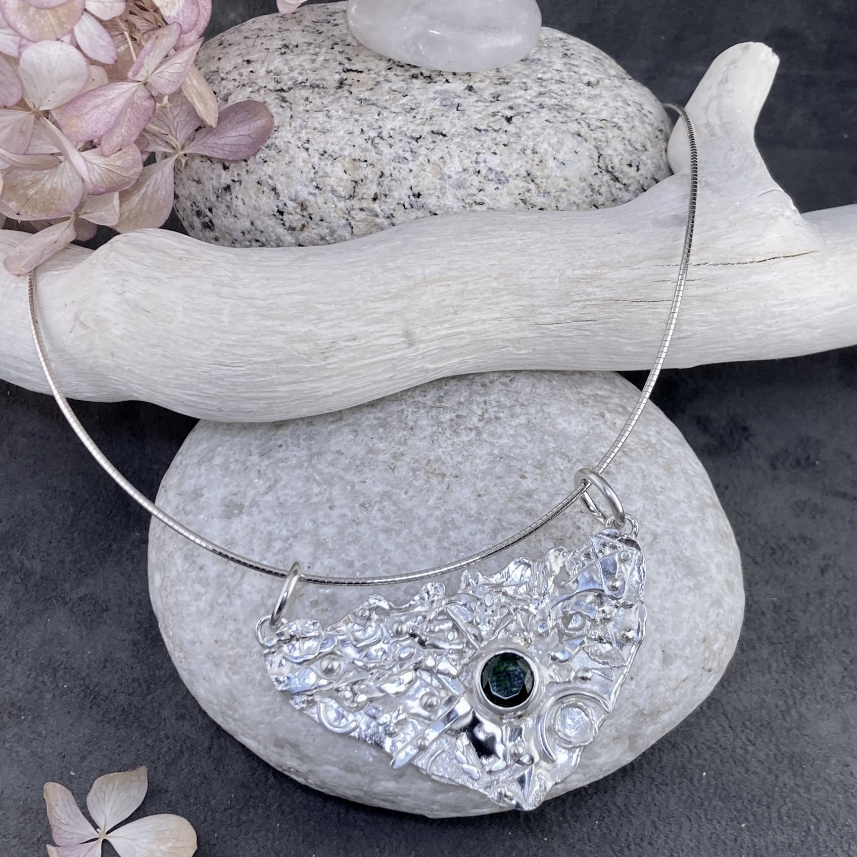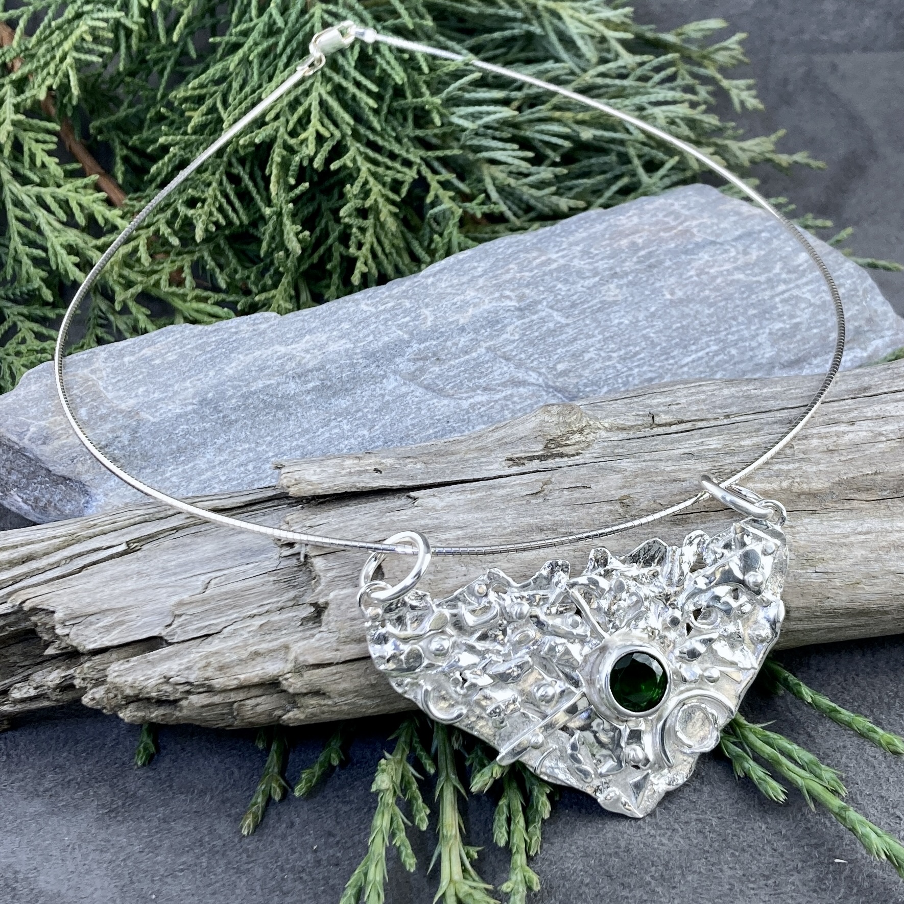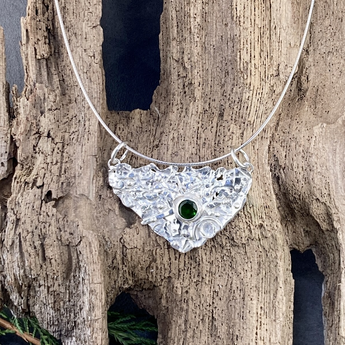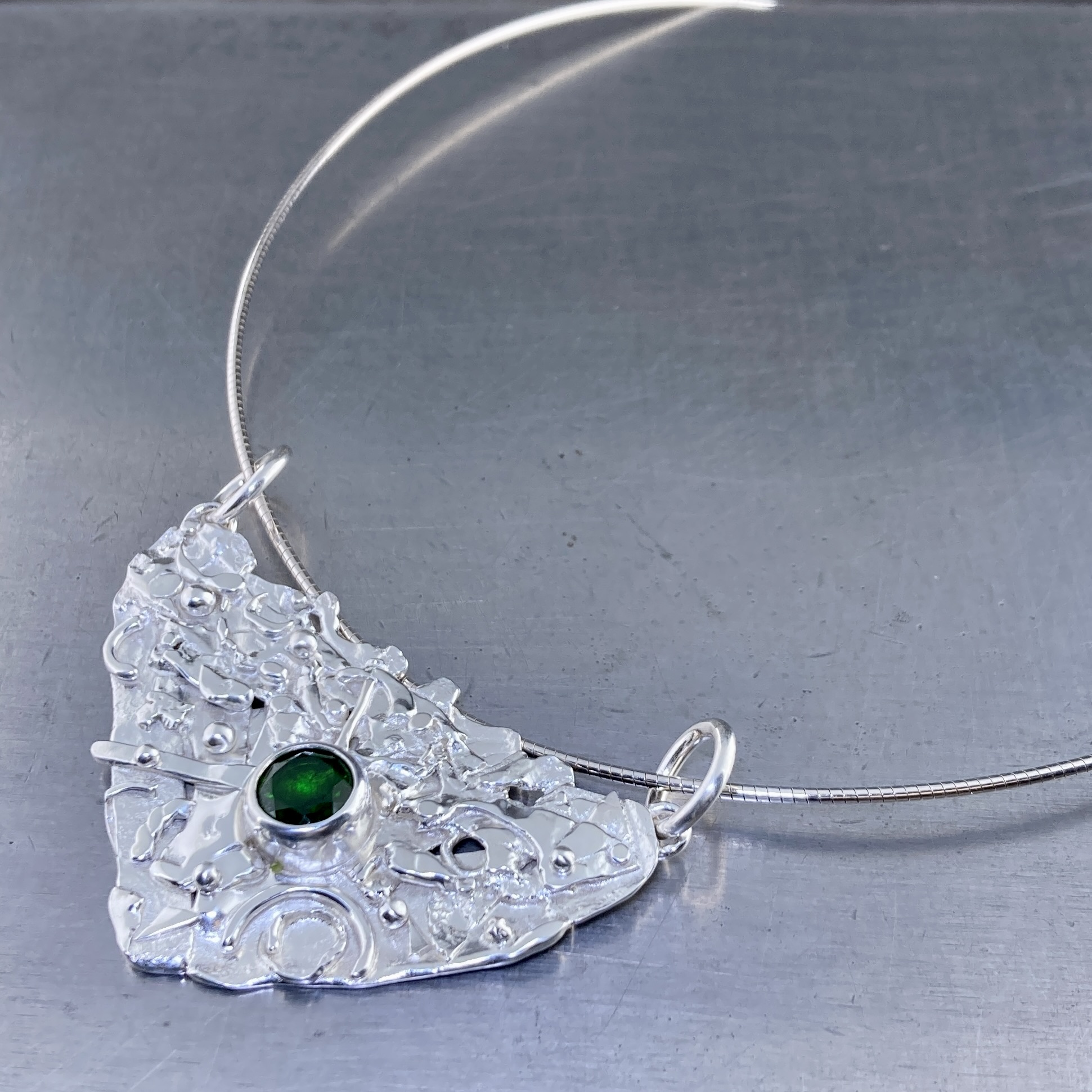 This is a Chrome Diopside gemstone – brilliant cut – 2 carats – in a bezel setting. I have used a bezel setting to add this stone to a horizontal – rapids design pendant.