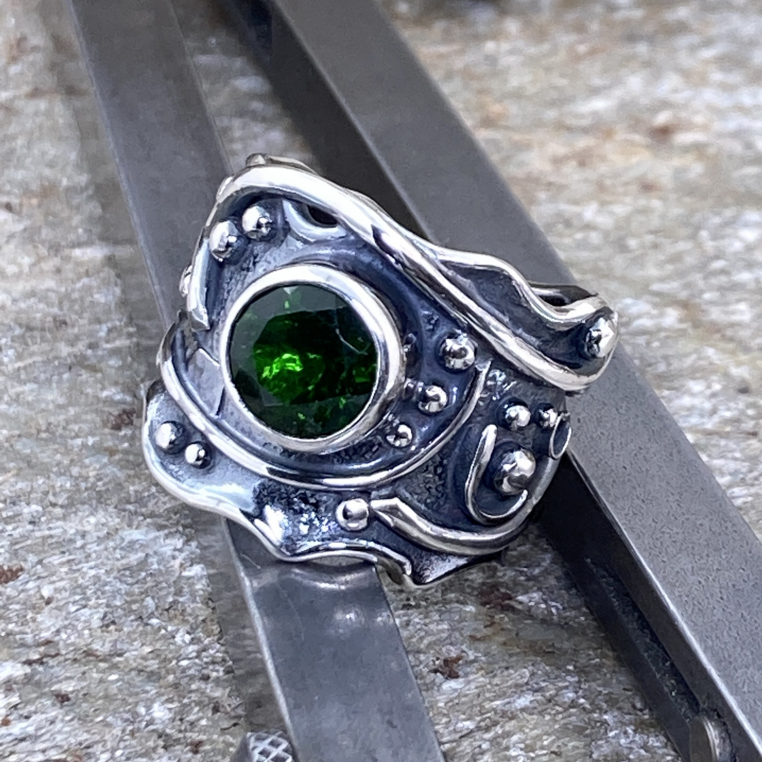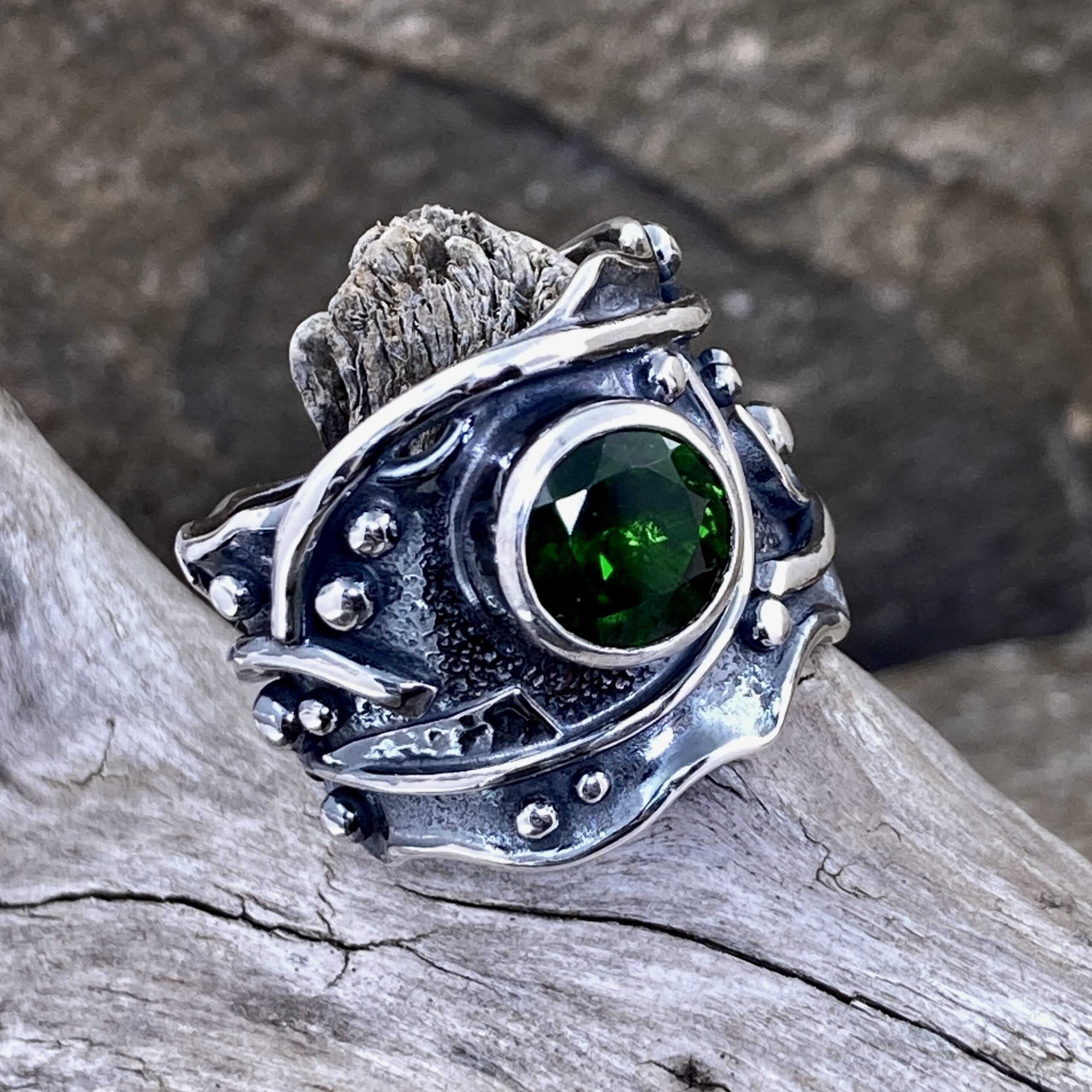 I heat and shape each silver band by hand, letting the metal flow into natural wave forms. Once refined and polished, the gemstone is bezel set to complete the design. The finished ring holds contrast — vivid green light against silver movement — capturing the rhythm of flowing water.