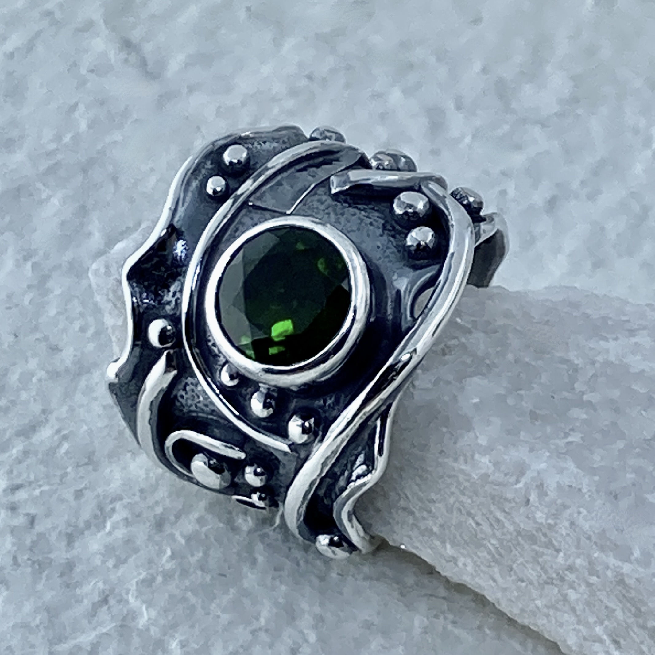 The Chrome Diopside Argentium Silver Ring Size 8.25 carries the quiet strength of water in motion. Its vivid green gemstone glows like light through deep river currents, framed by smooth, flowing silver.