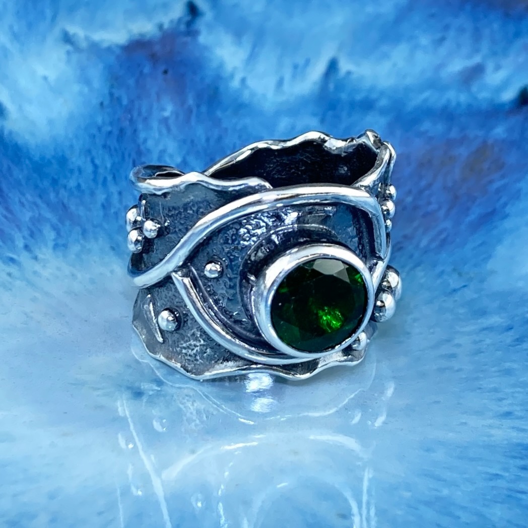The Chrome Diopside Argentium Silver Ring Size 8 captures depth and movement in the Antique Water style. Its rich green gemstone glows like sunlight through deep waves, framed by the organic rhythm of textured silver.