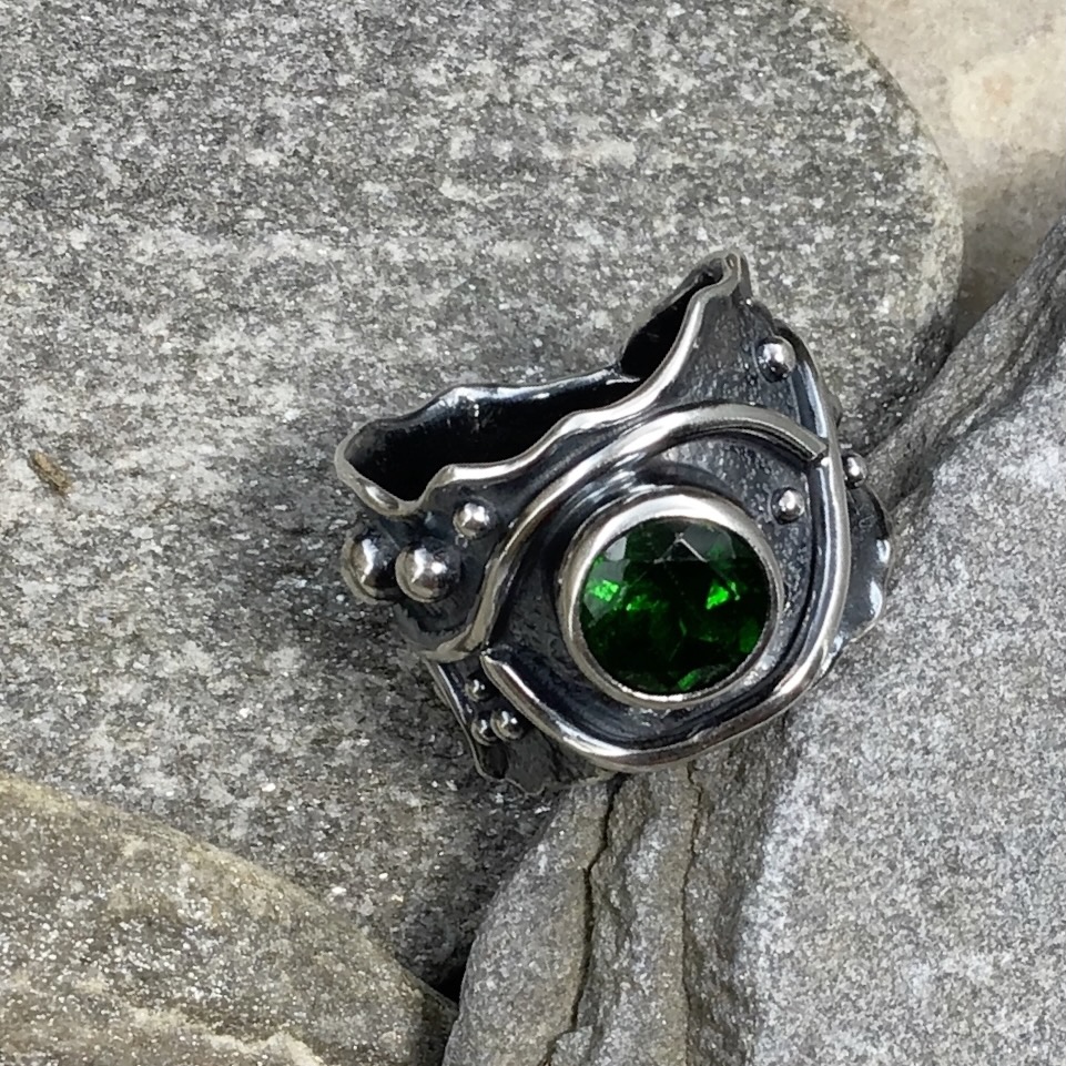 A round, 2.5 carat, brilliant-cut Chrome Diopside rests in a smooth bezel setting. The gemstone’s vivid green colour contrasts beautifully with the antique silver surface, adding clarity and vitality to the ring’s flowing form.