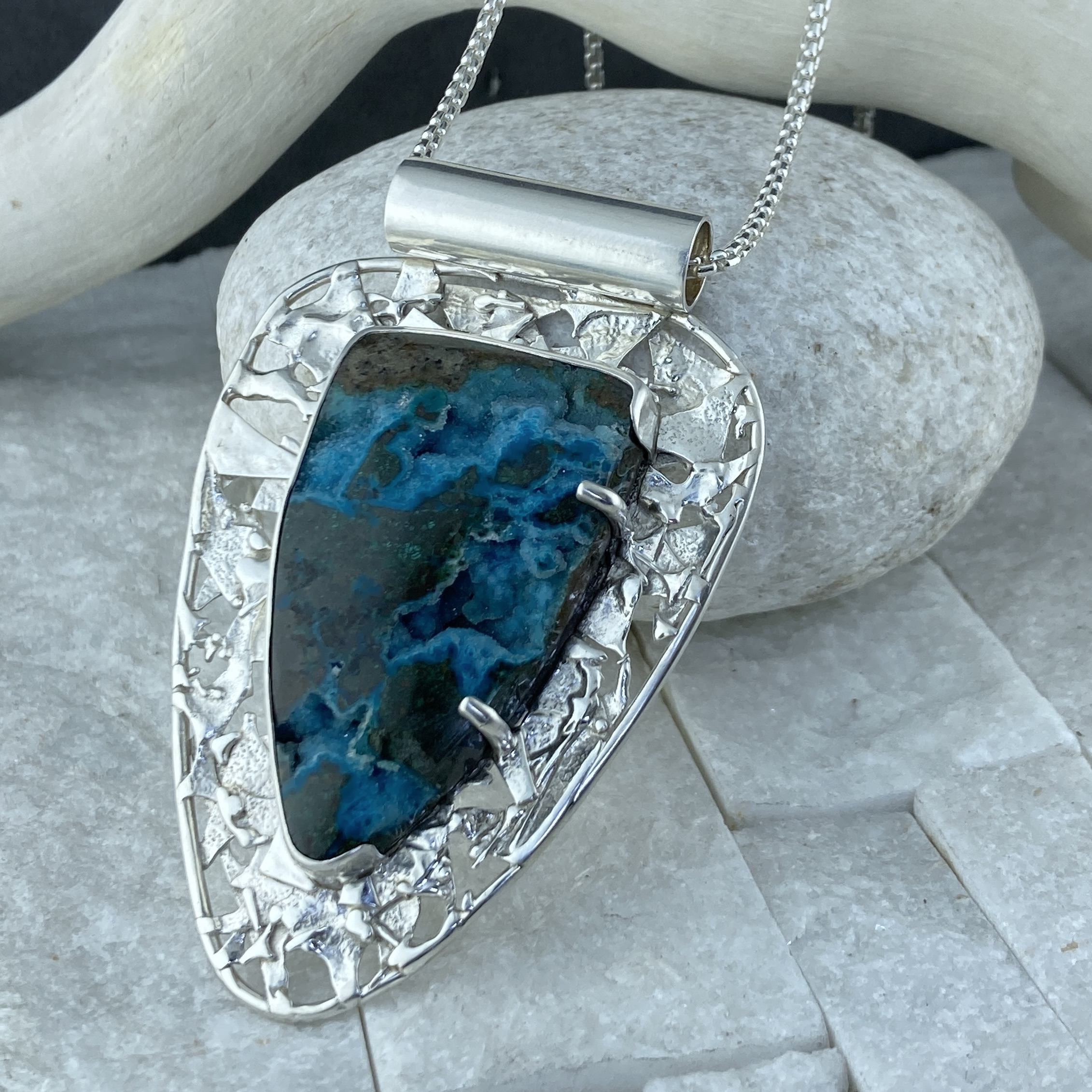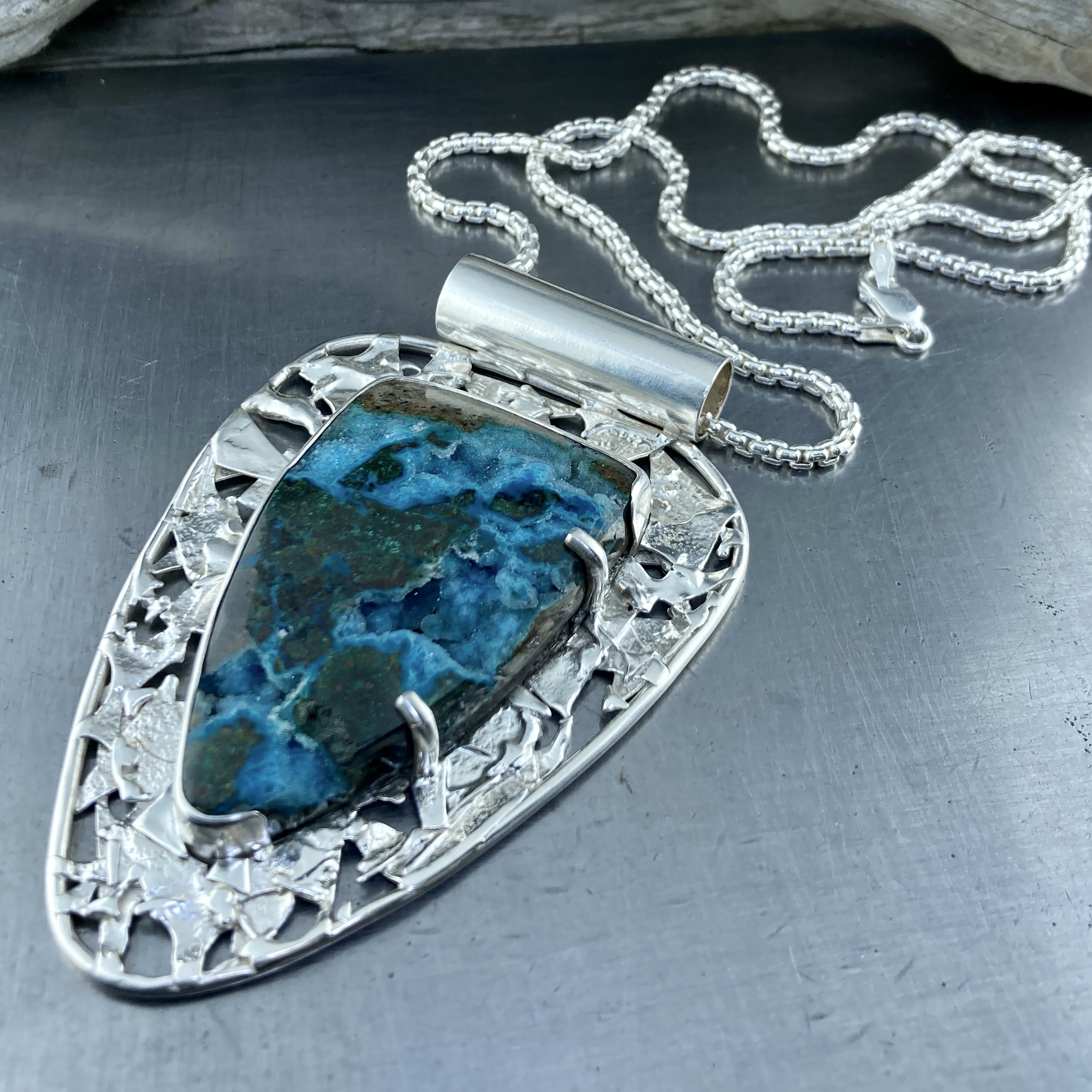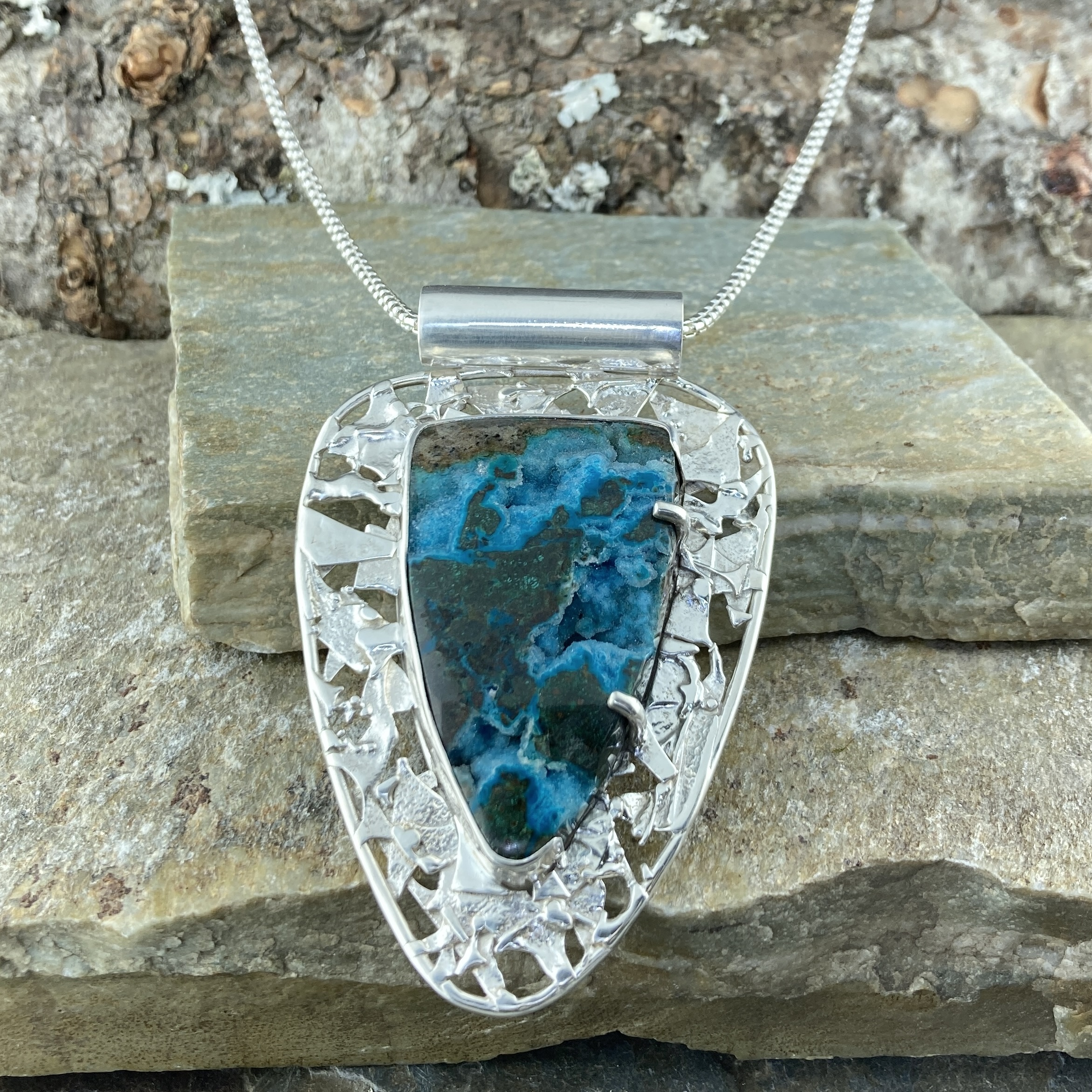 chrysocolla druzy pendant – Argentium silver rapids – 118 carat