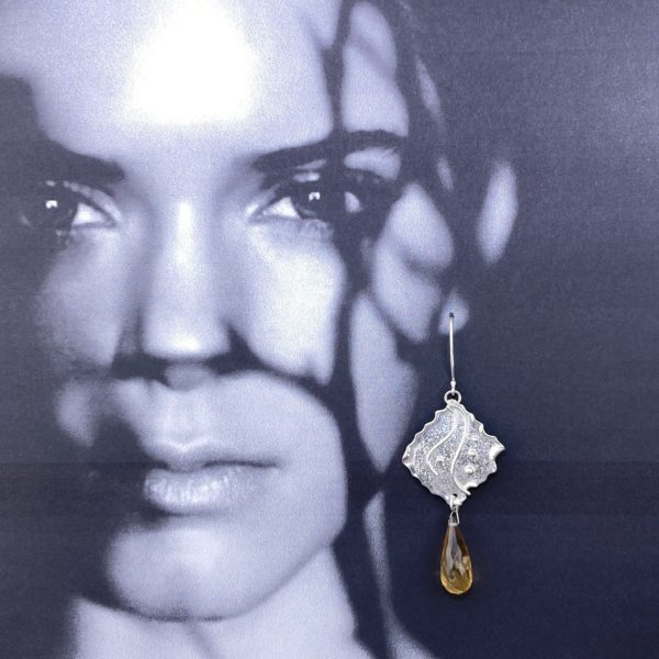 For the ‘waves’ design (in the Water Design group) I start by imprinting Argentium silver sheet with sand – for a nice beach texture. Then I cut out matching shapes of silver for an earring pair. I always make my earrings in pairs, so that the final earrings are a ‘mirror’ pair – a left and right earring.