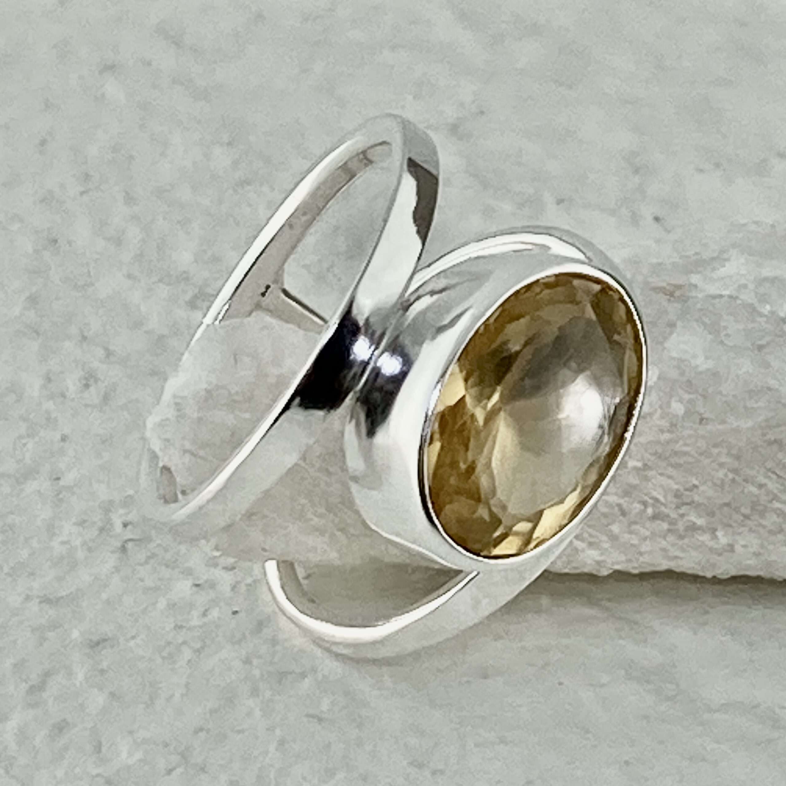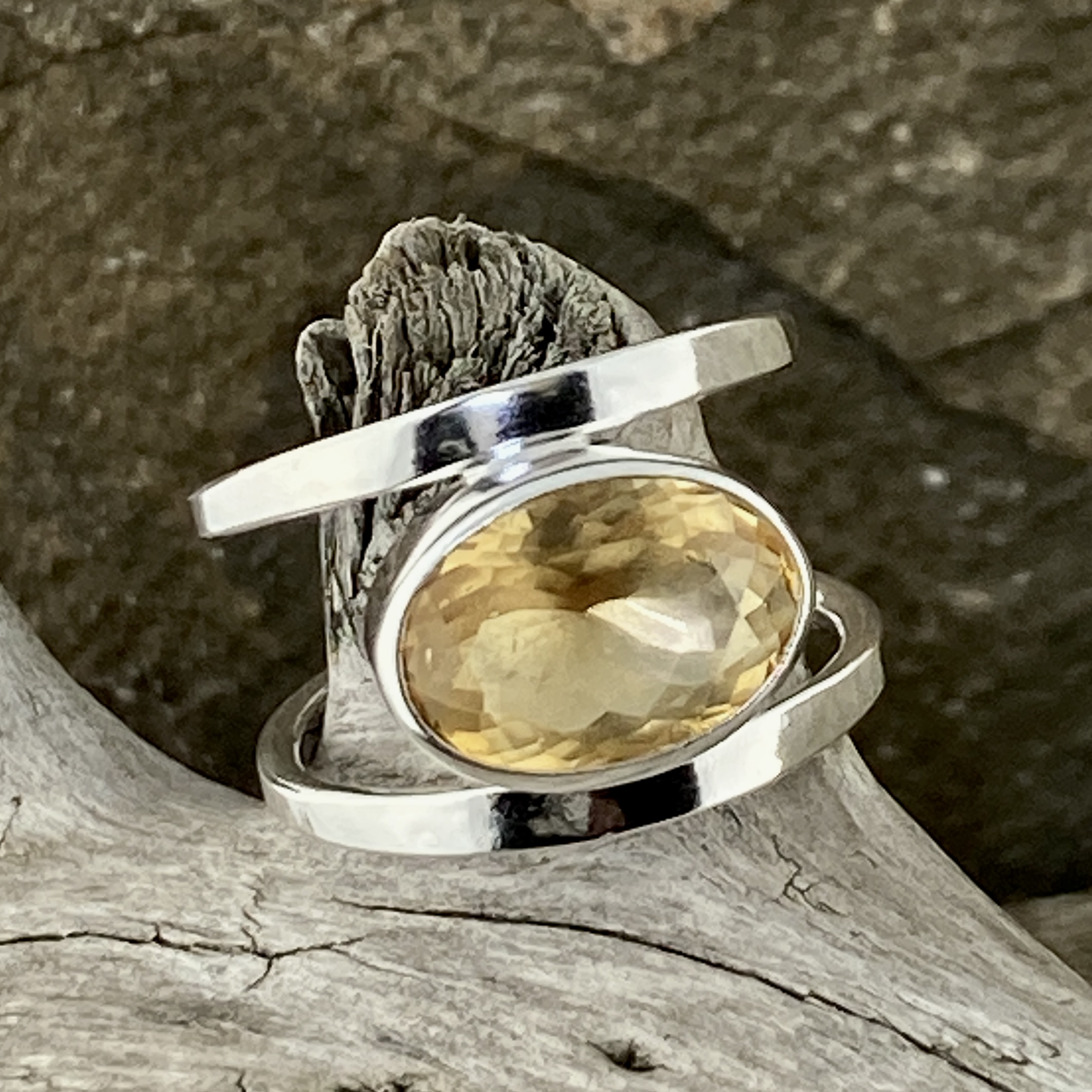 This 6-carat oval Citrine shows rich golden-orange colour with soft sparkle. The bezel setting holds it firmly between the two silver bands, allowing light to pass through and enhance the gem’s natural glow. Its warm tone contrasts beautifully with the cool shine of Argentium silver.