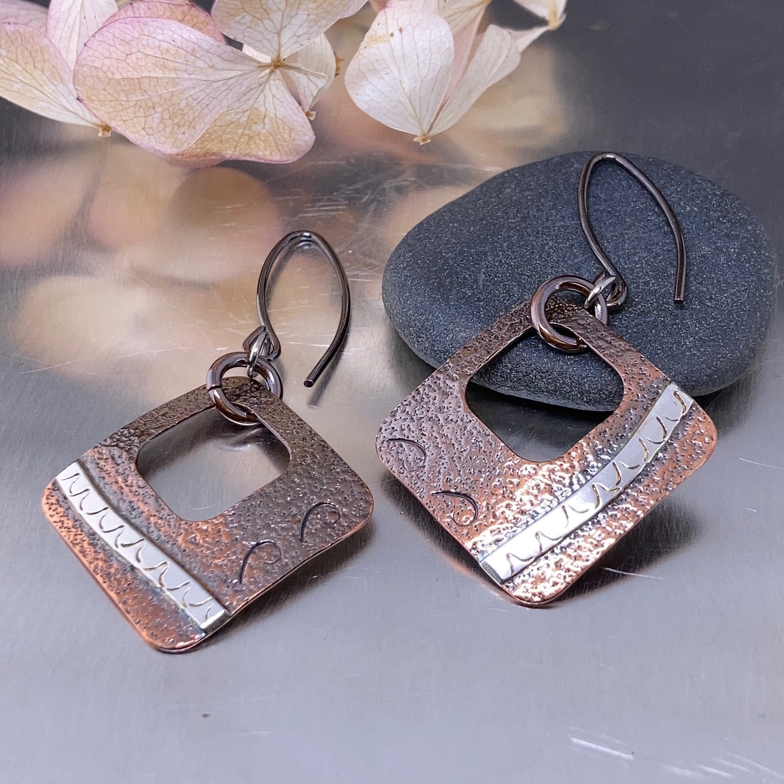 A diamond shape cut from solid copper, then a centre punch out – also diamond shaped. Argentium silver is fused to the top and then the entire earring is hand stamped.