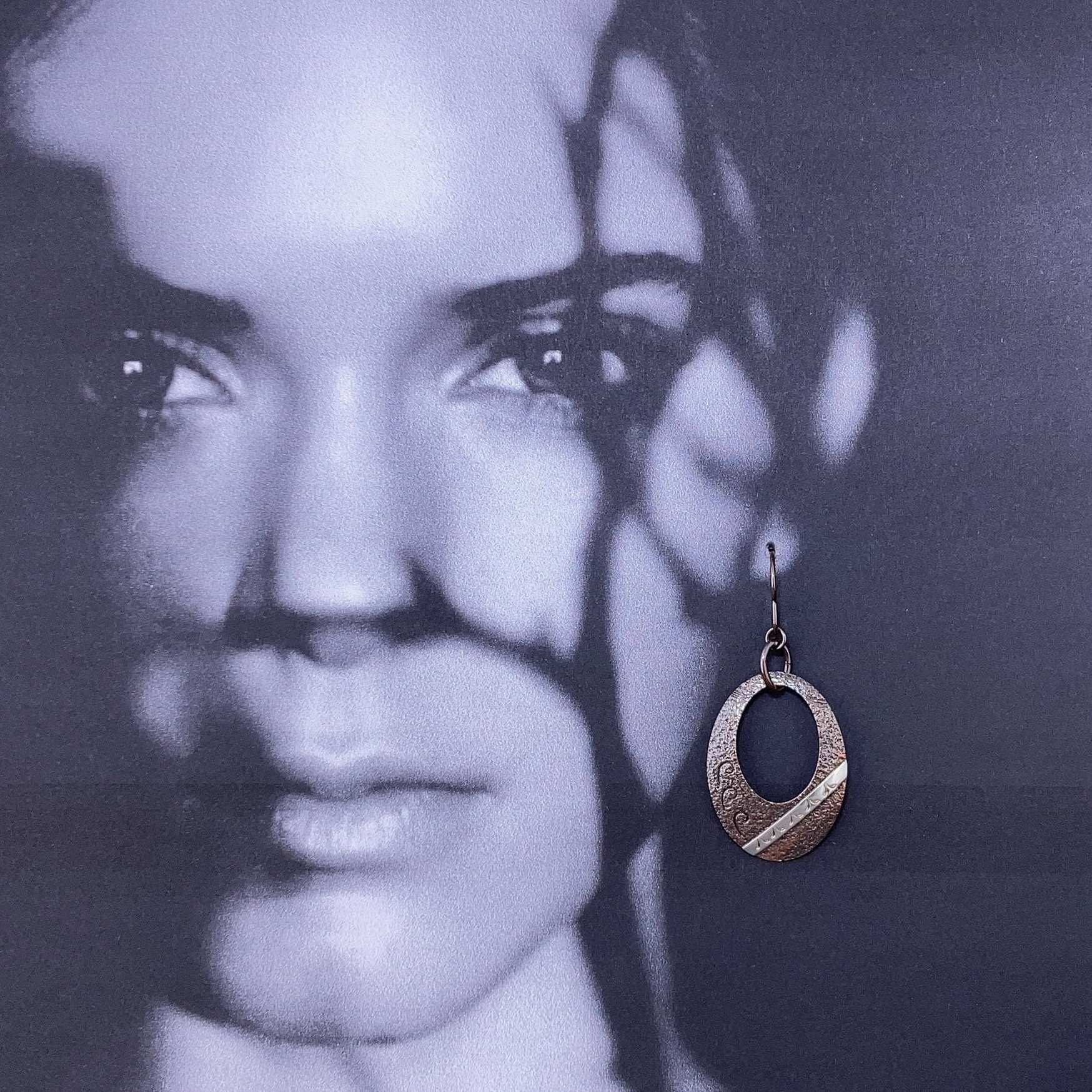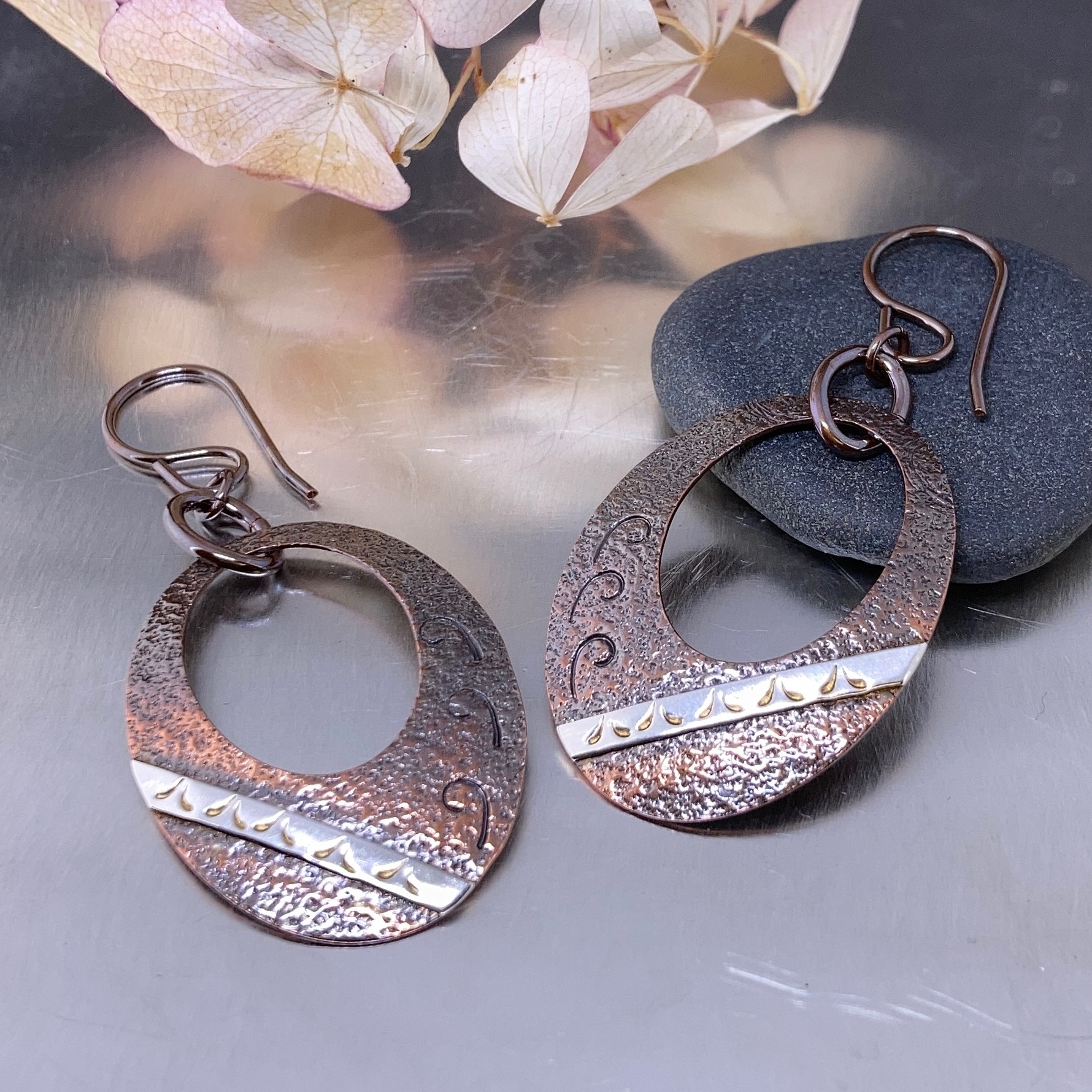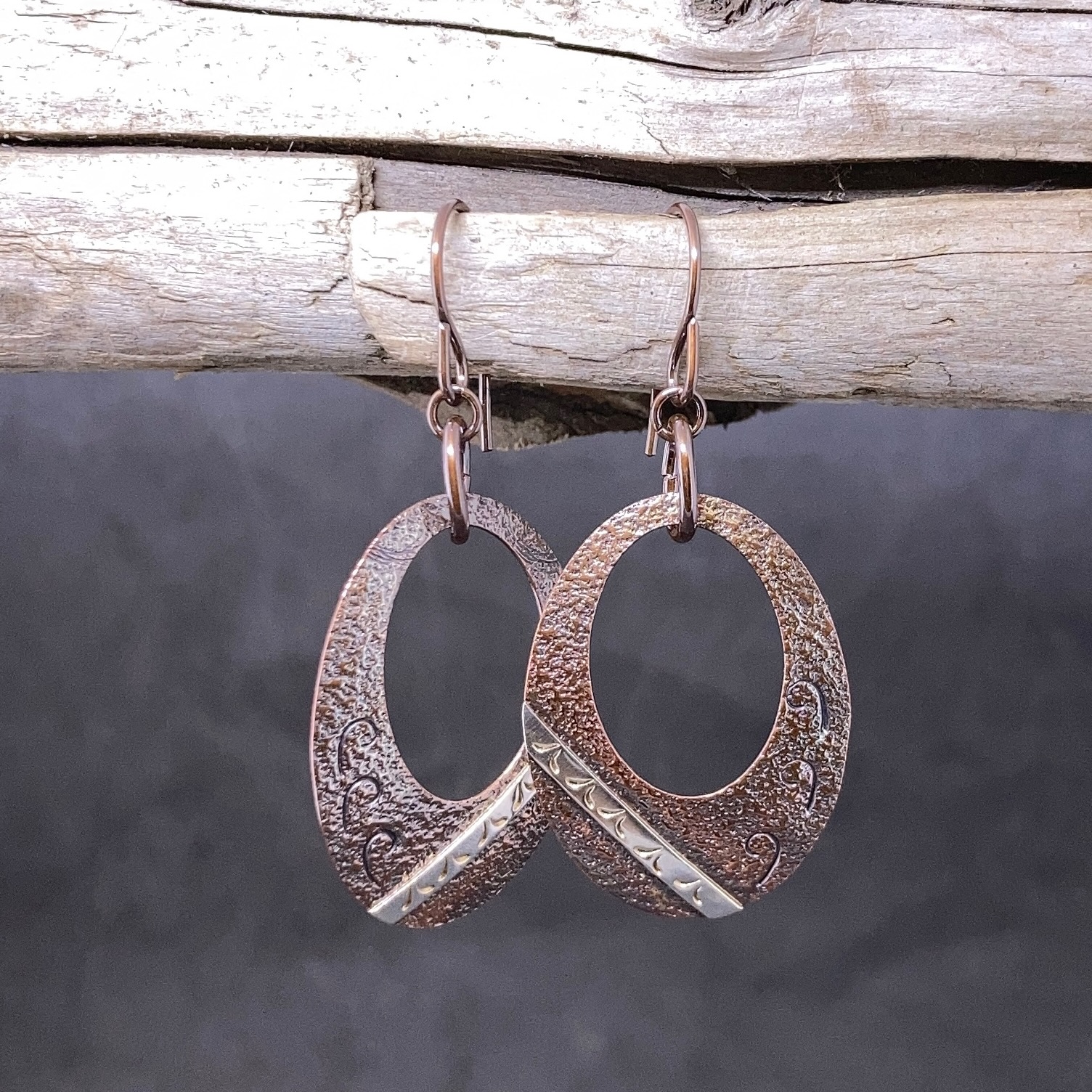 The oval shape is cut from solid copper, then textured. With a punch out detail and then a strip of Argentium silver is fused to the surface. Hand stamped with a different pattern every time.