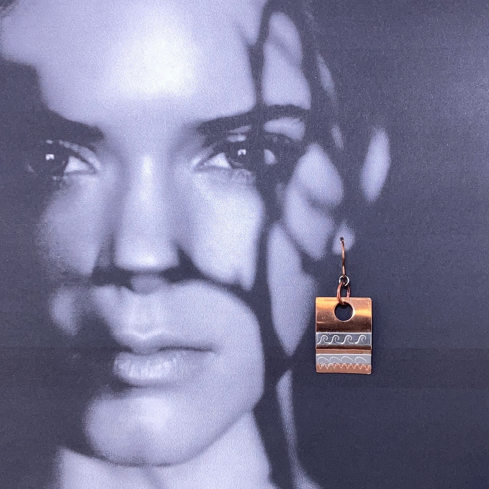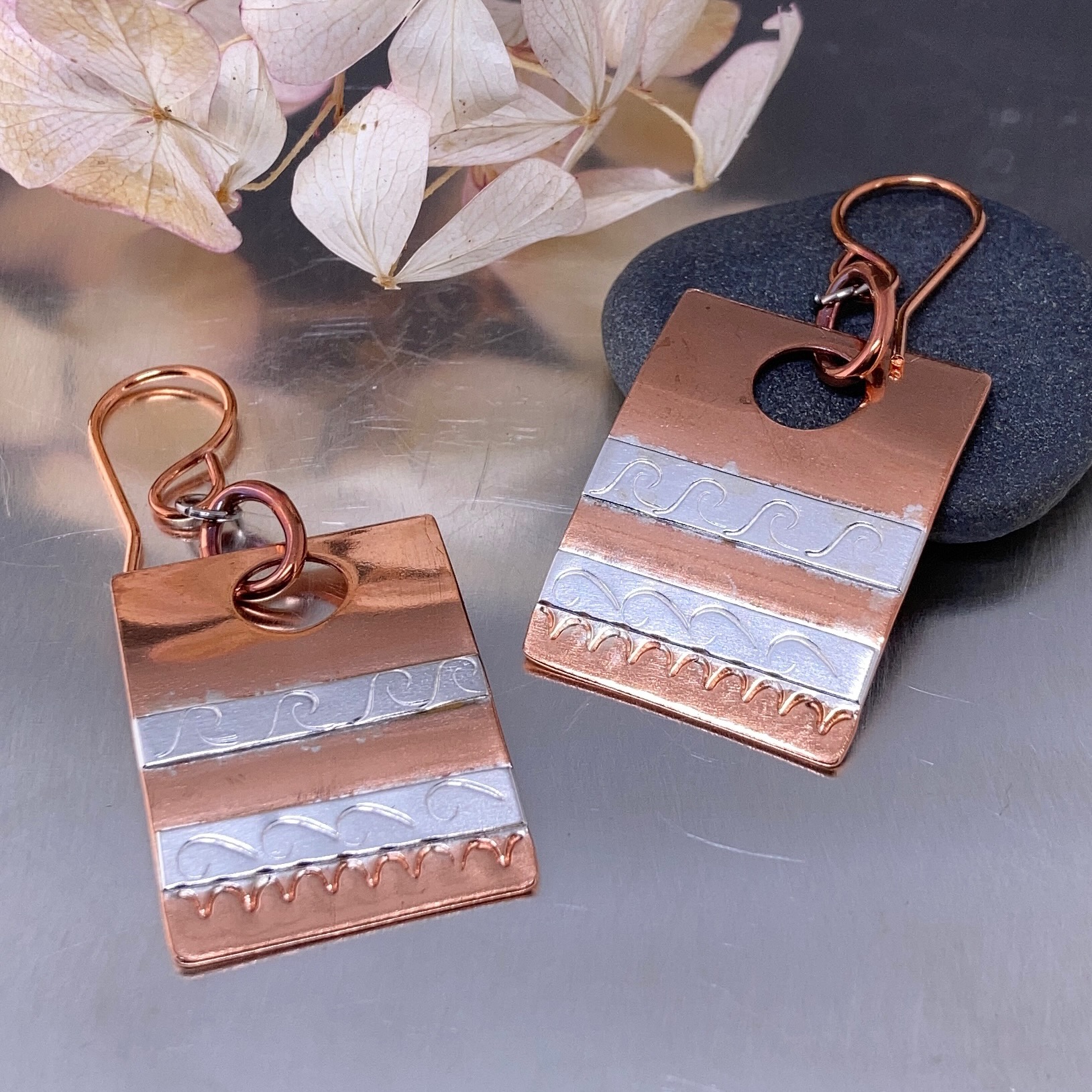 A solid copper rectangle with two strips of Argentium silver fused on top, and then hand stamped.