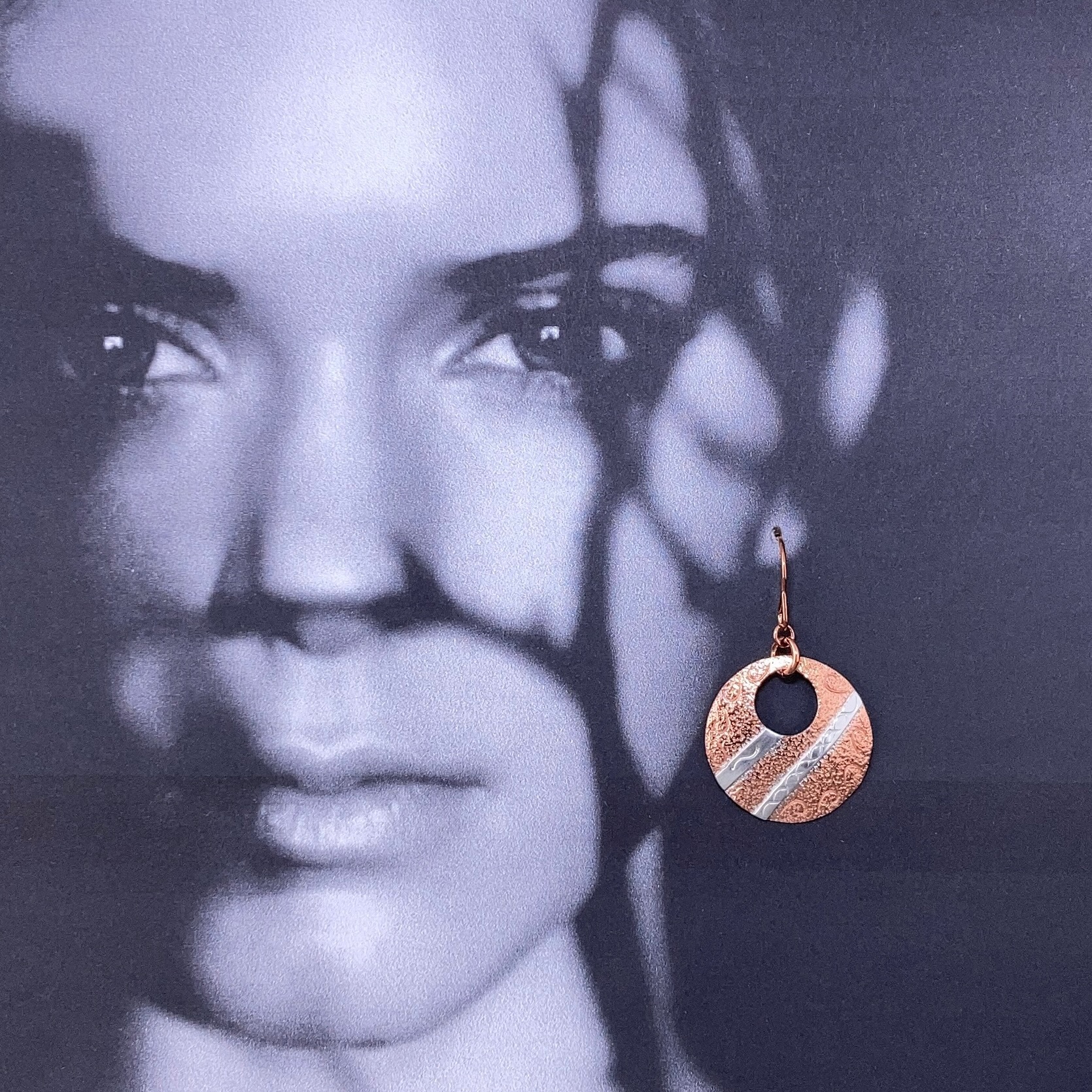 The round shape is cut from solid copper, then textured. With a punch out hole in the top and then a strip of Argentium silver is fused to the surface. And then hand stamped with a different pattern every time.
