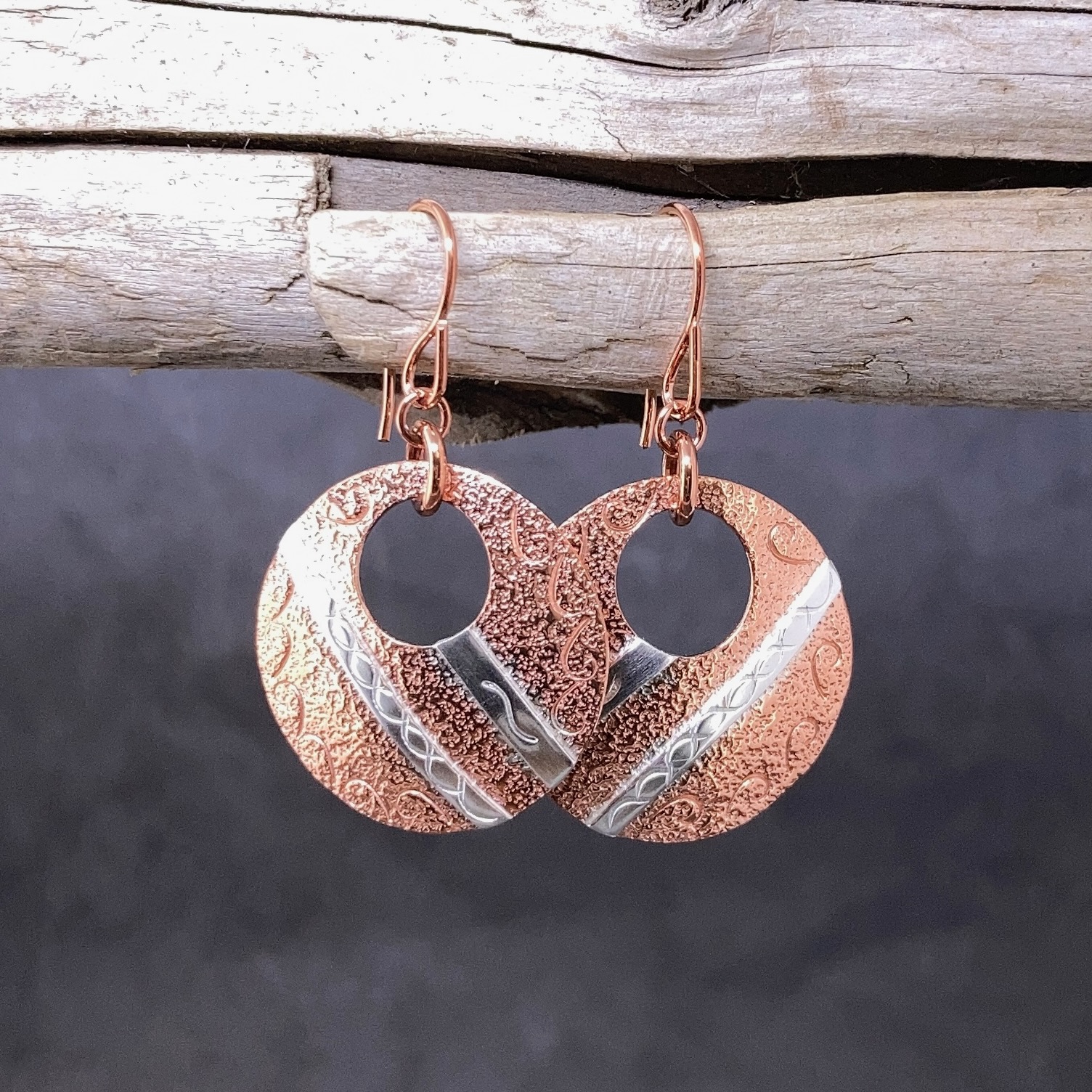 copper and silver round earrings