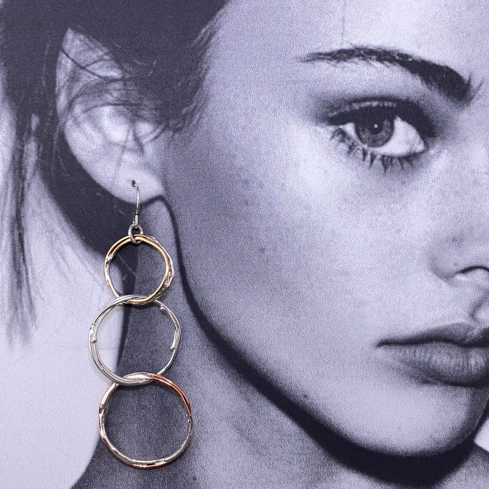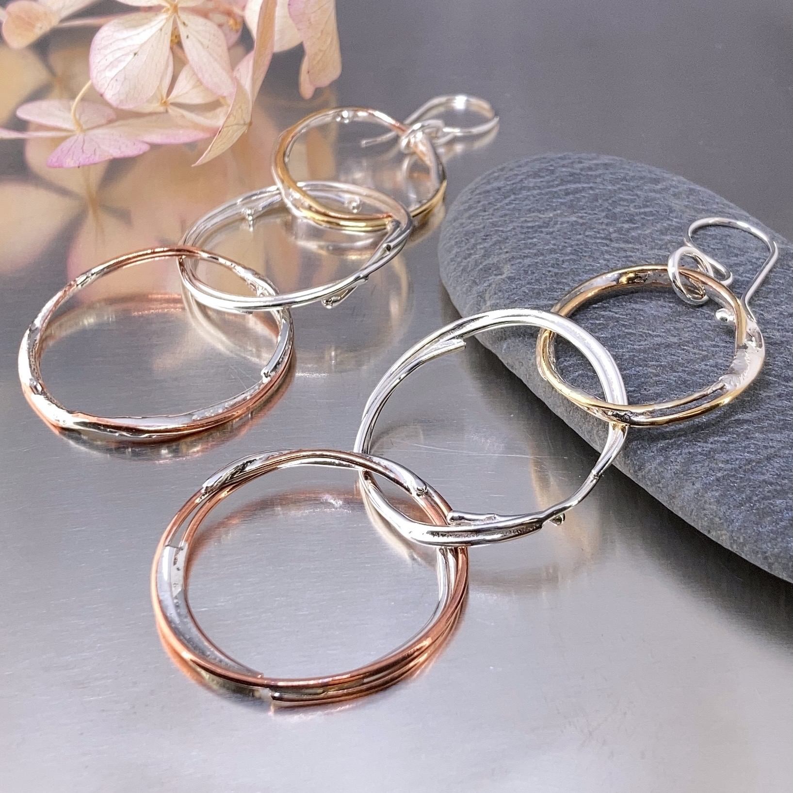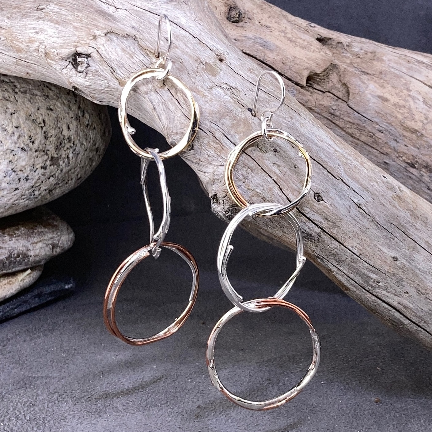 Handmade from solid Copper, Argentium silver and Brass wire. I wrap the wire to form a rough hollow boulder – interlinking them as I go. Then I carefully fuse each one by adding molten Argentium silver. They are permanently linked thru each other – but not attached. Lots of movement and play!