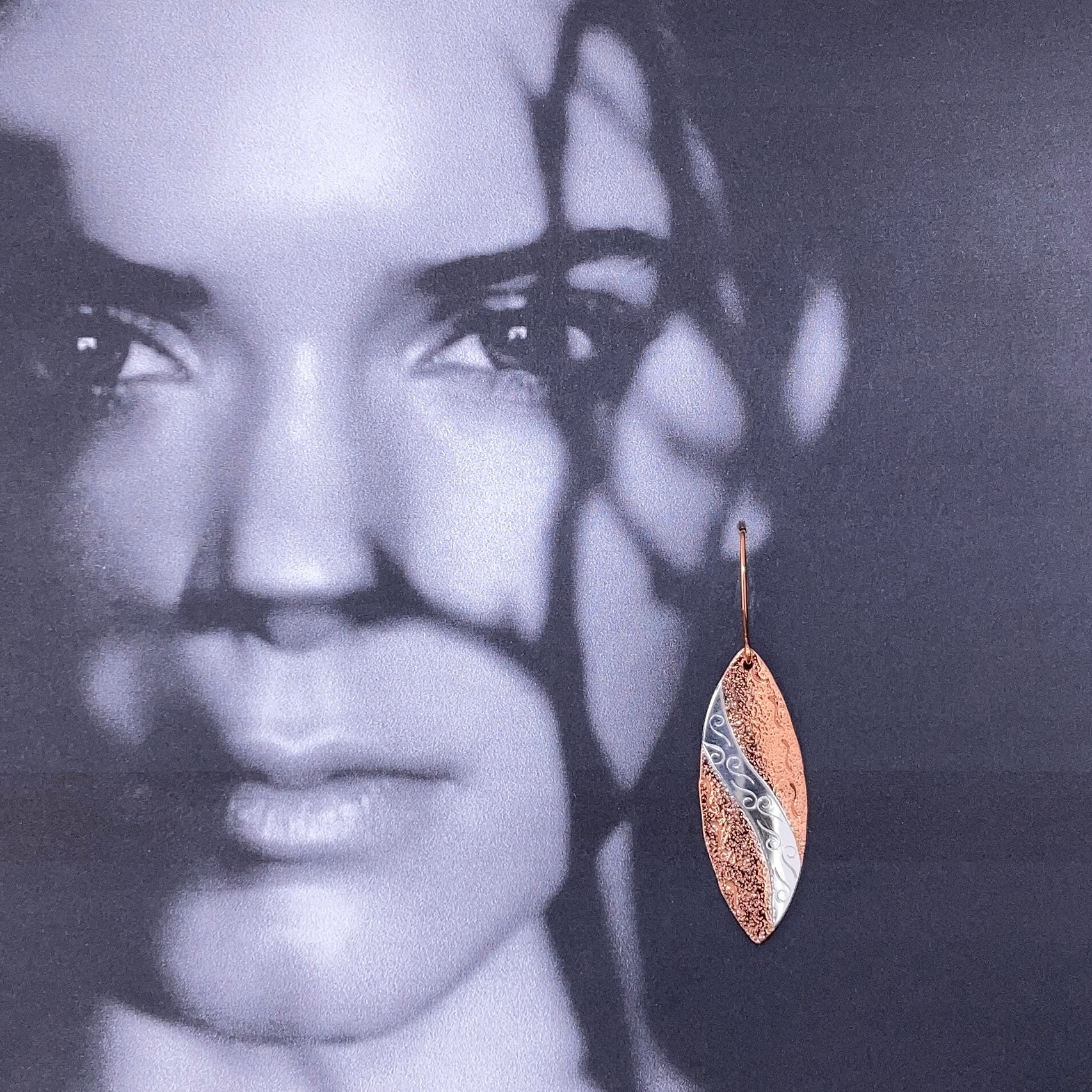 I cut a marquise shape out of solid copper and then fused a strip of Argentium silver to it. Then hand stamped a design.
