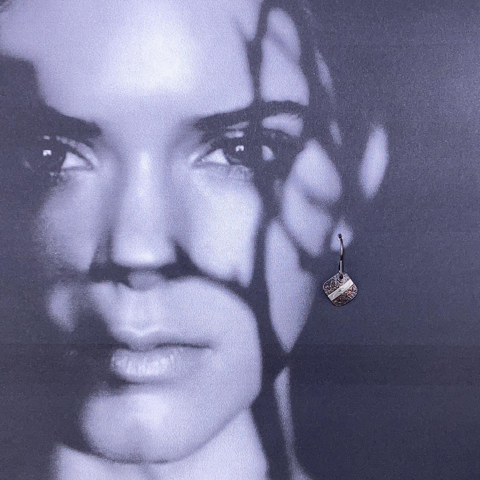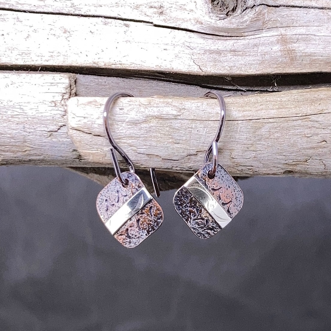 Argentium silver is fused to the copper, then stamped, then dapped for a curve – then antiqued.