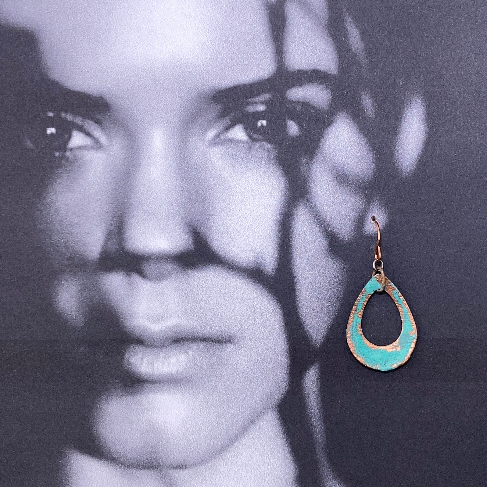 Solid copper with a blue patina. Patina is lacquered to preserve the finish. The teardrop shape is cut from a sheet of solid copper, textured and then a centre cut-out is added for extra detail.