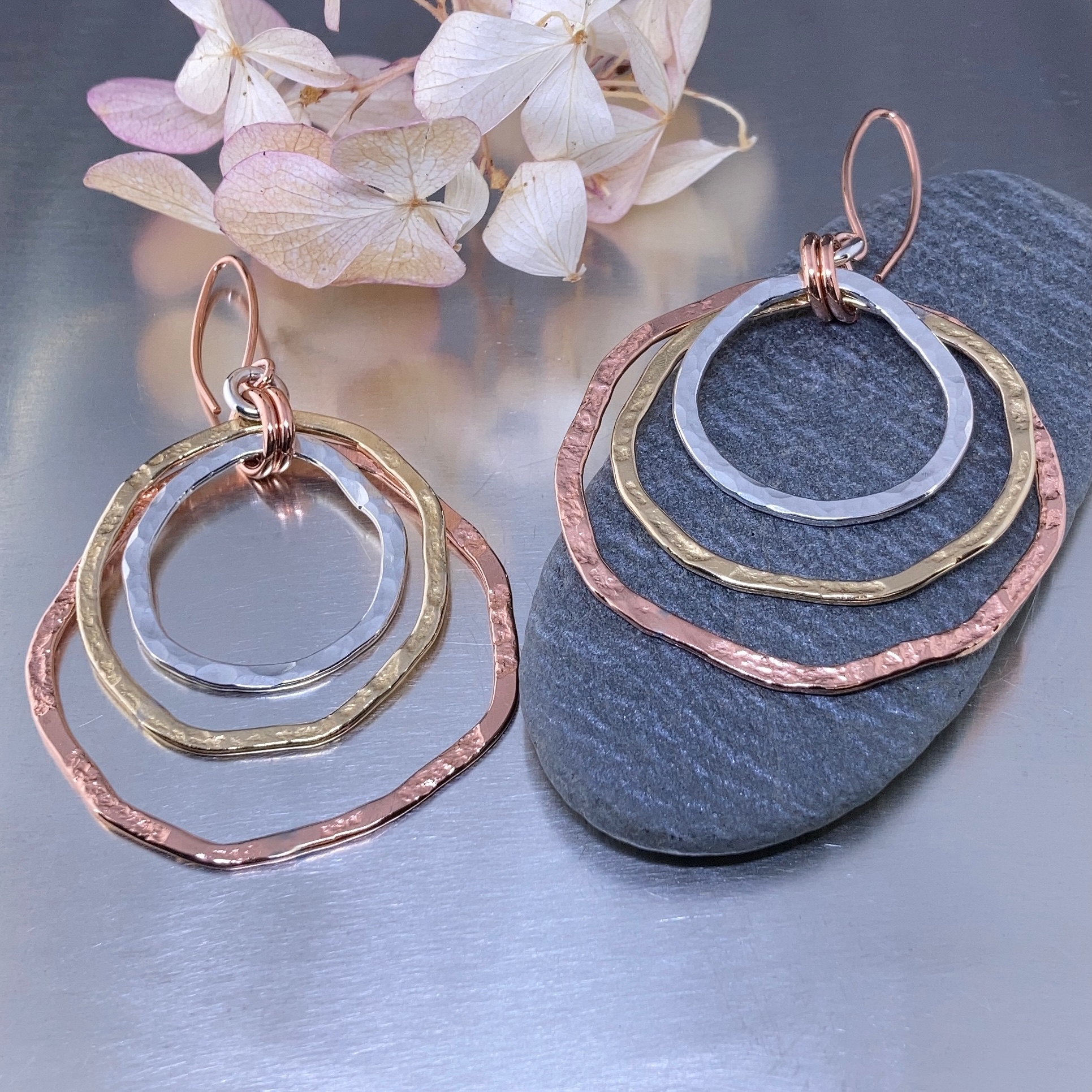 Solid Copper, Brass and Argentium silver boulder shaped rings. After forming and soldering these Boulders, I then texture them with either a hammer or etching wheels. And then I joined them stacked on top of each other with hand made jump rings.