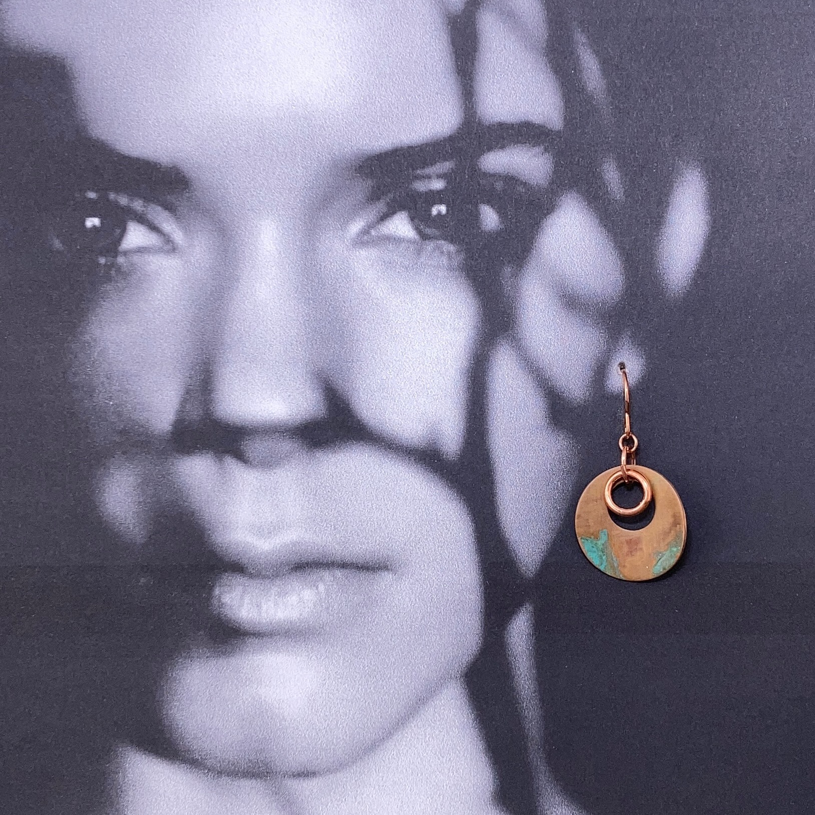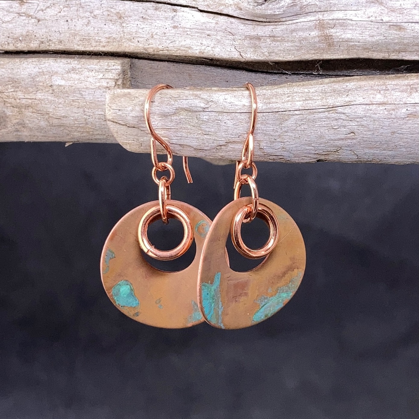 These earrings have an round cut from solid copper.   A centre cut-out is added, then the round is slightly cupped.  The patina is painted on and let develop, and then covered with a lacquer for permanence.  The patina is a natural process and will develop differently every time – so expect some variations from the photo.