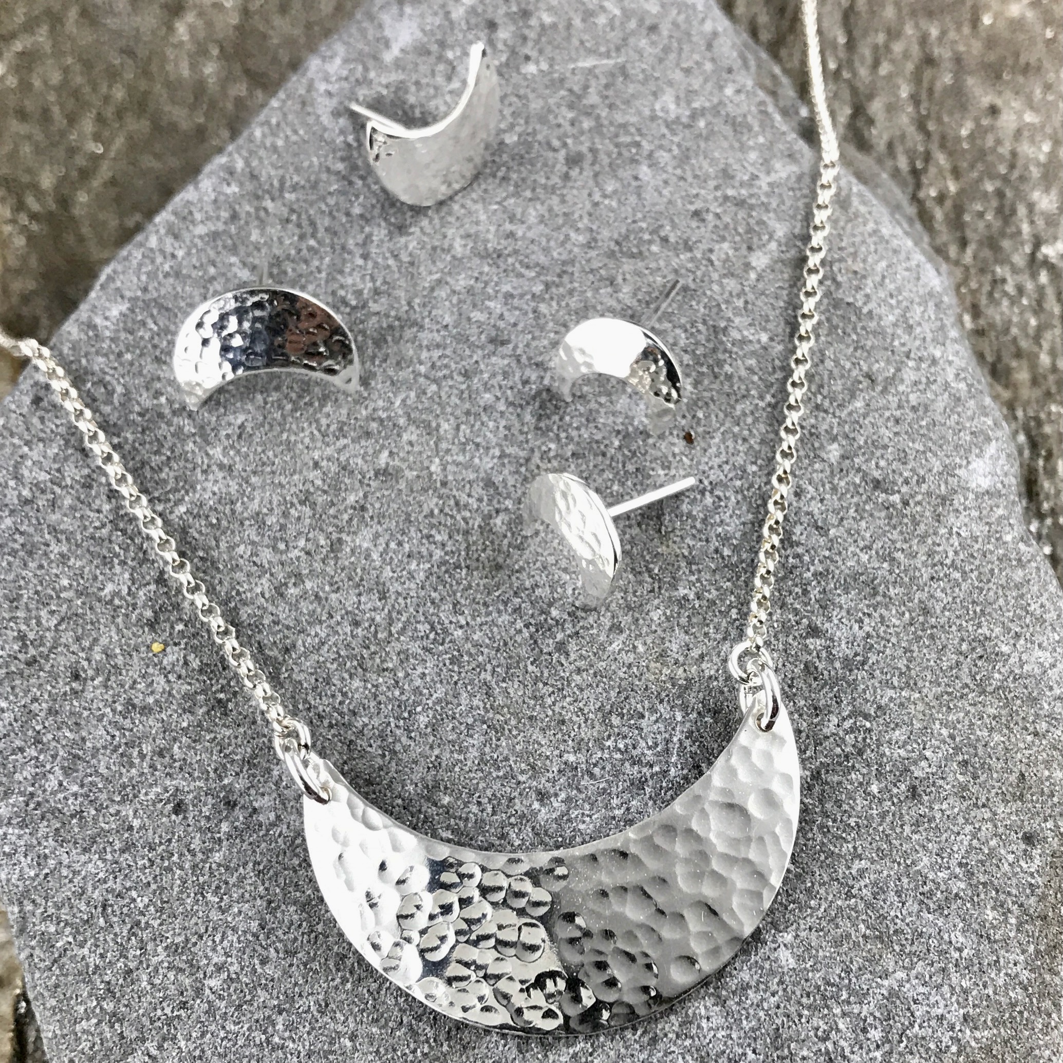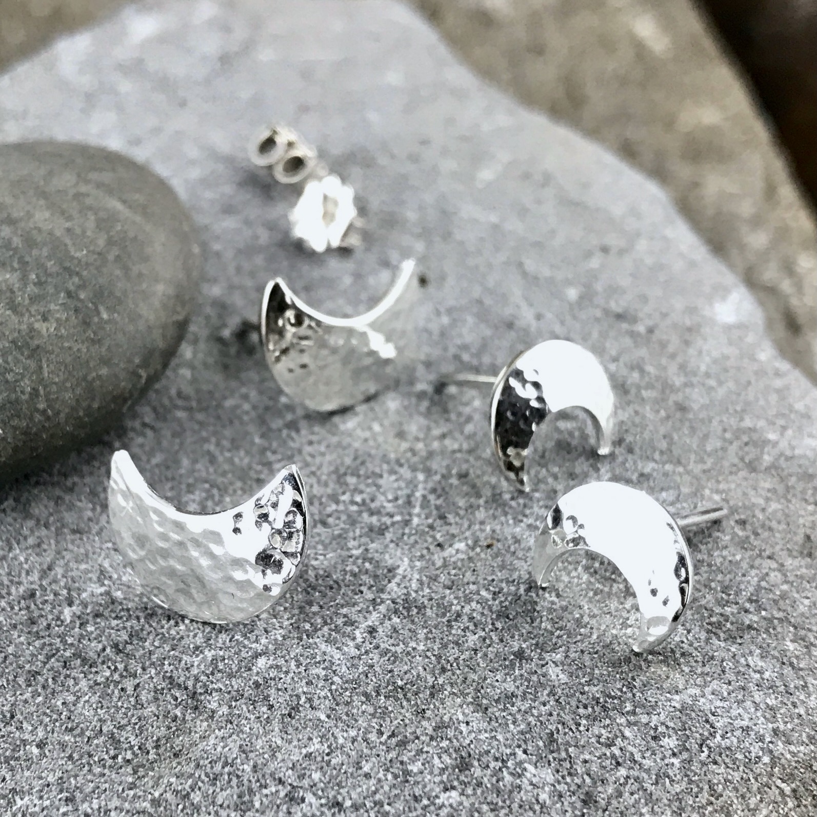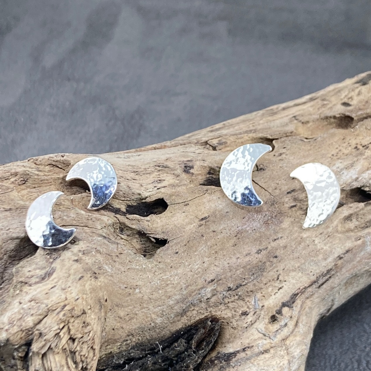 Argentium silver earrings.  Crescent moons, cut in 2 earring sizes, and then hand hammered.  Post and Butterfly are also Argentium silver.