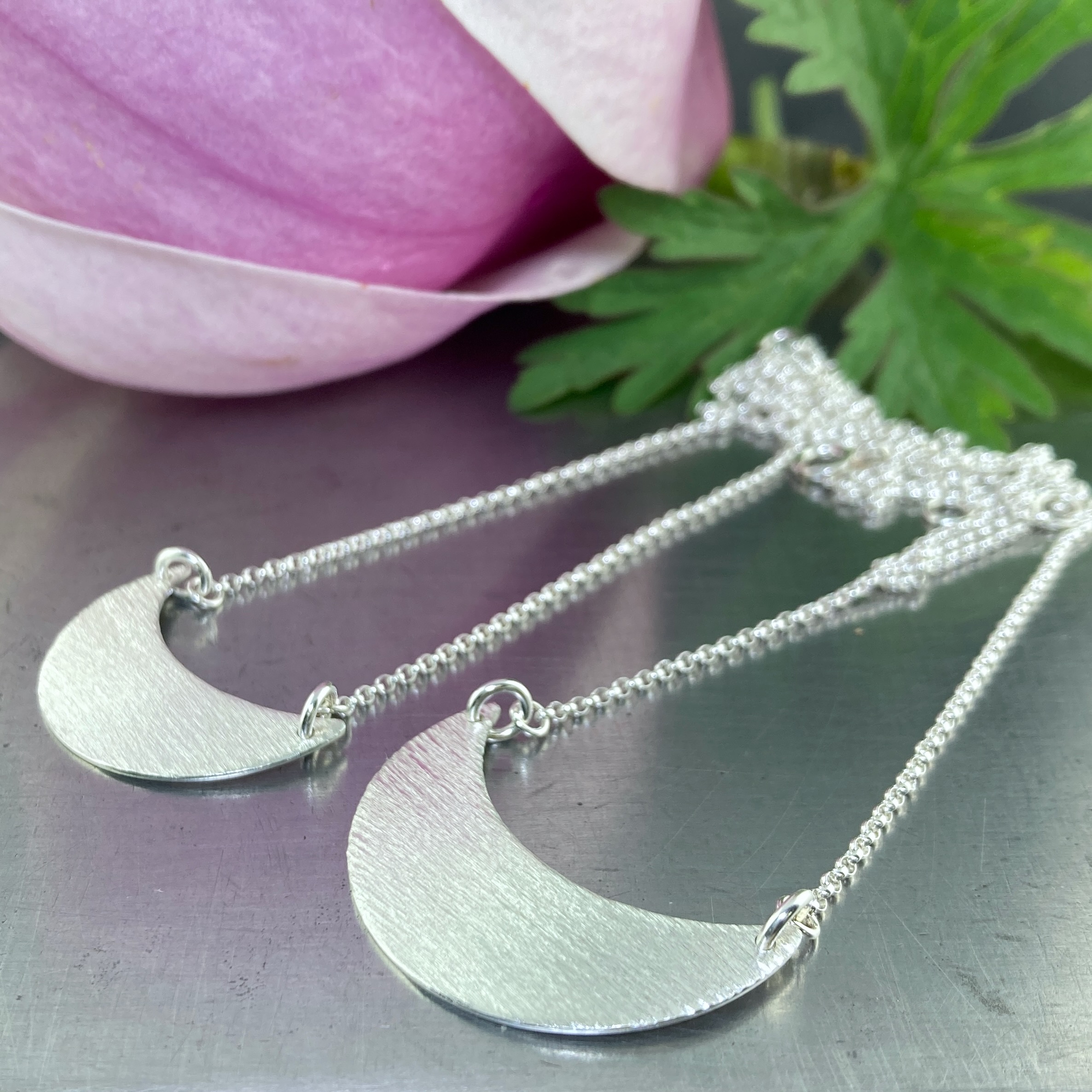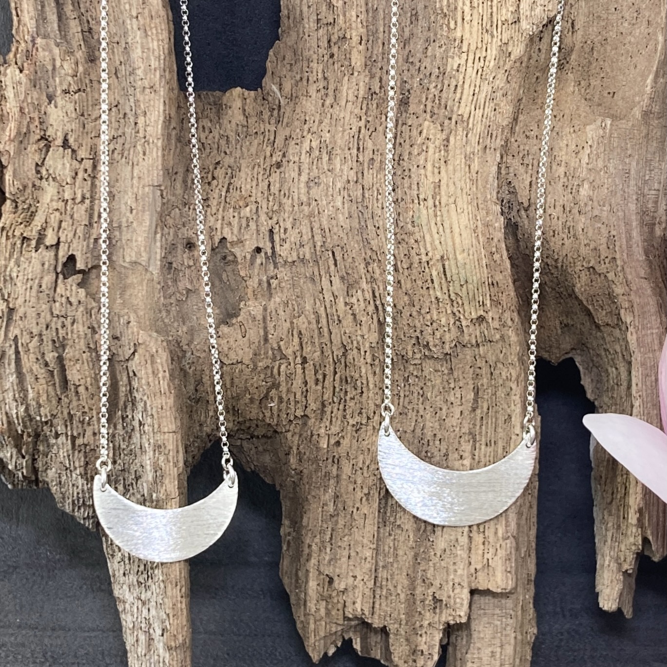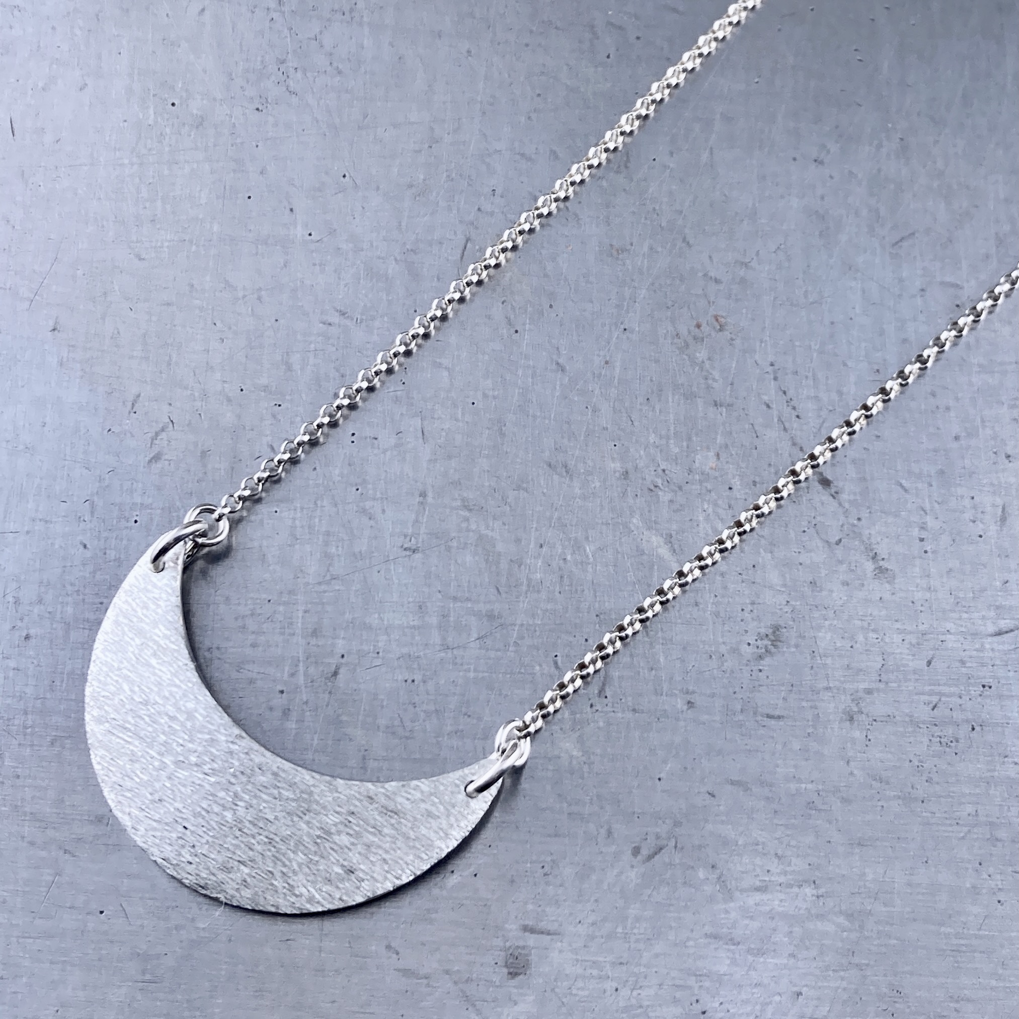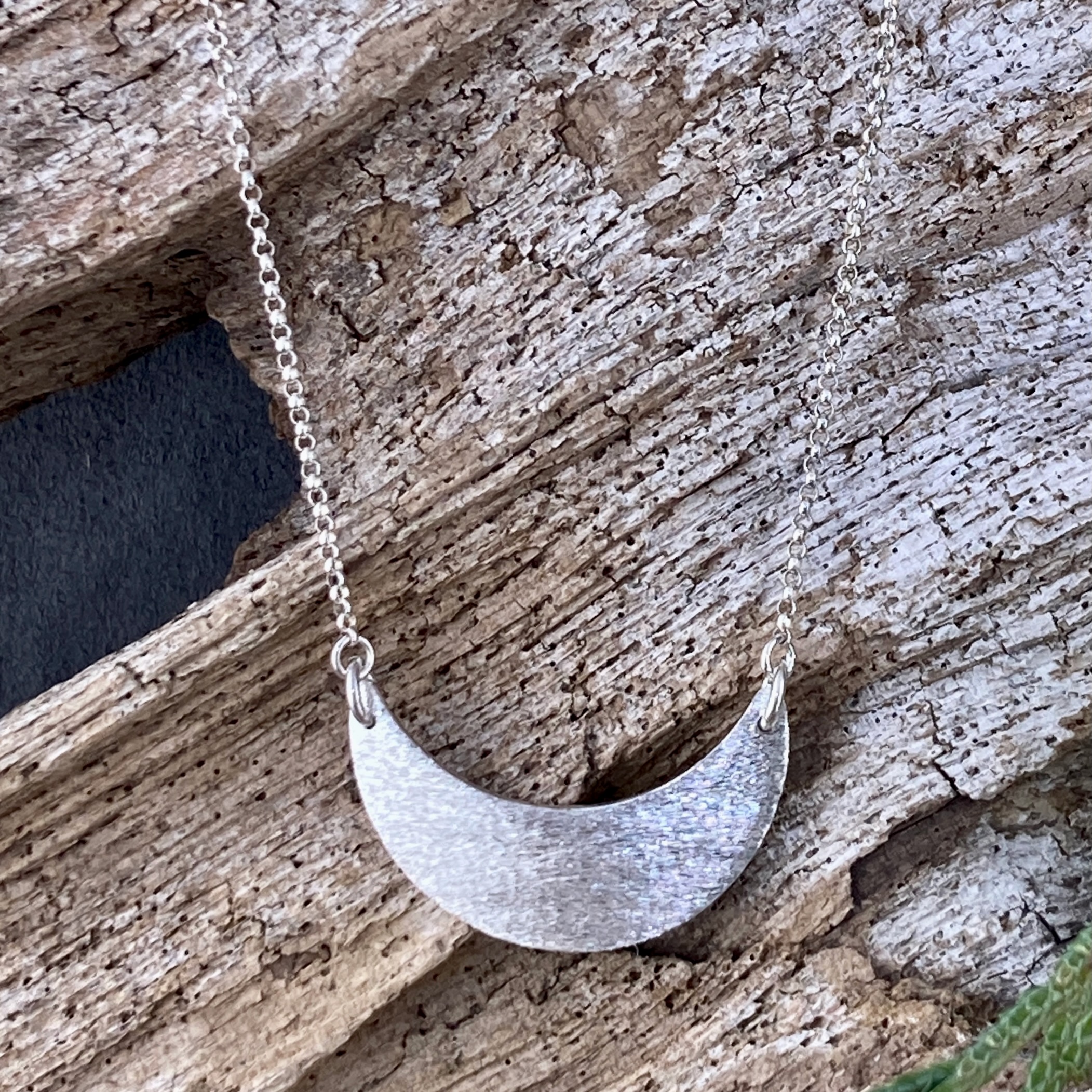 Crescent moon on chain – Linear etched finish.  Argentium silver Crescent moon with an attached 16″ to 18″ Sterling silver Rolo chain.  Hand etched with a Linear finish.