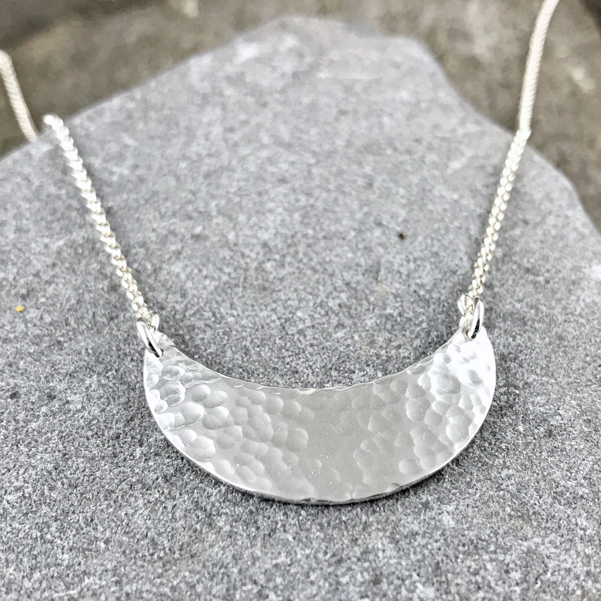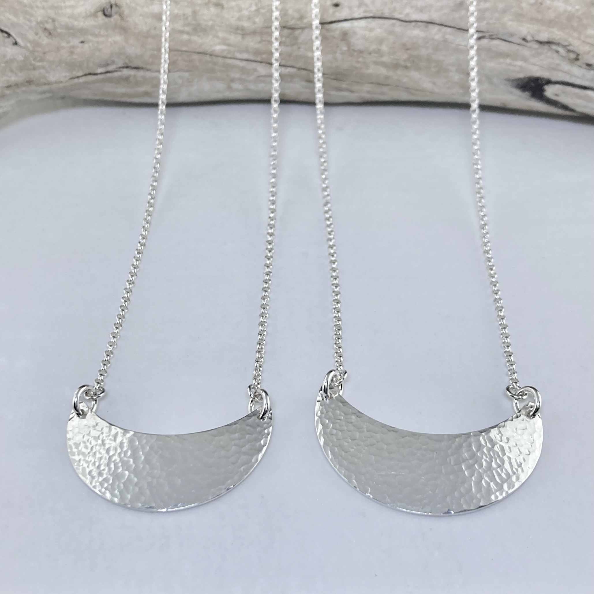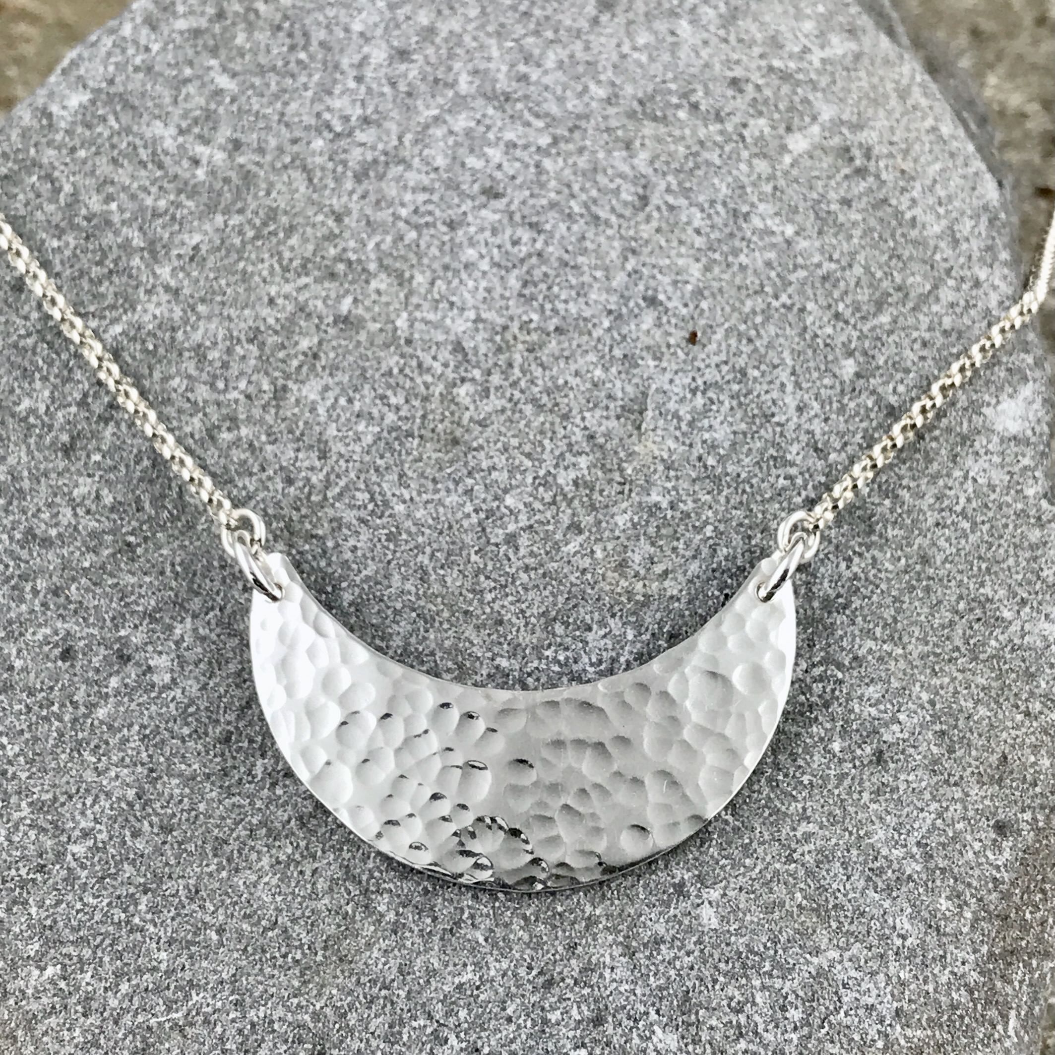 Crescent moon on chain – hammered finish. Argentium silver Crescent moon with an attached 16″ to 18″ Sterling silver Rolo chain. Hand hammered finish.